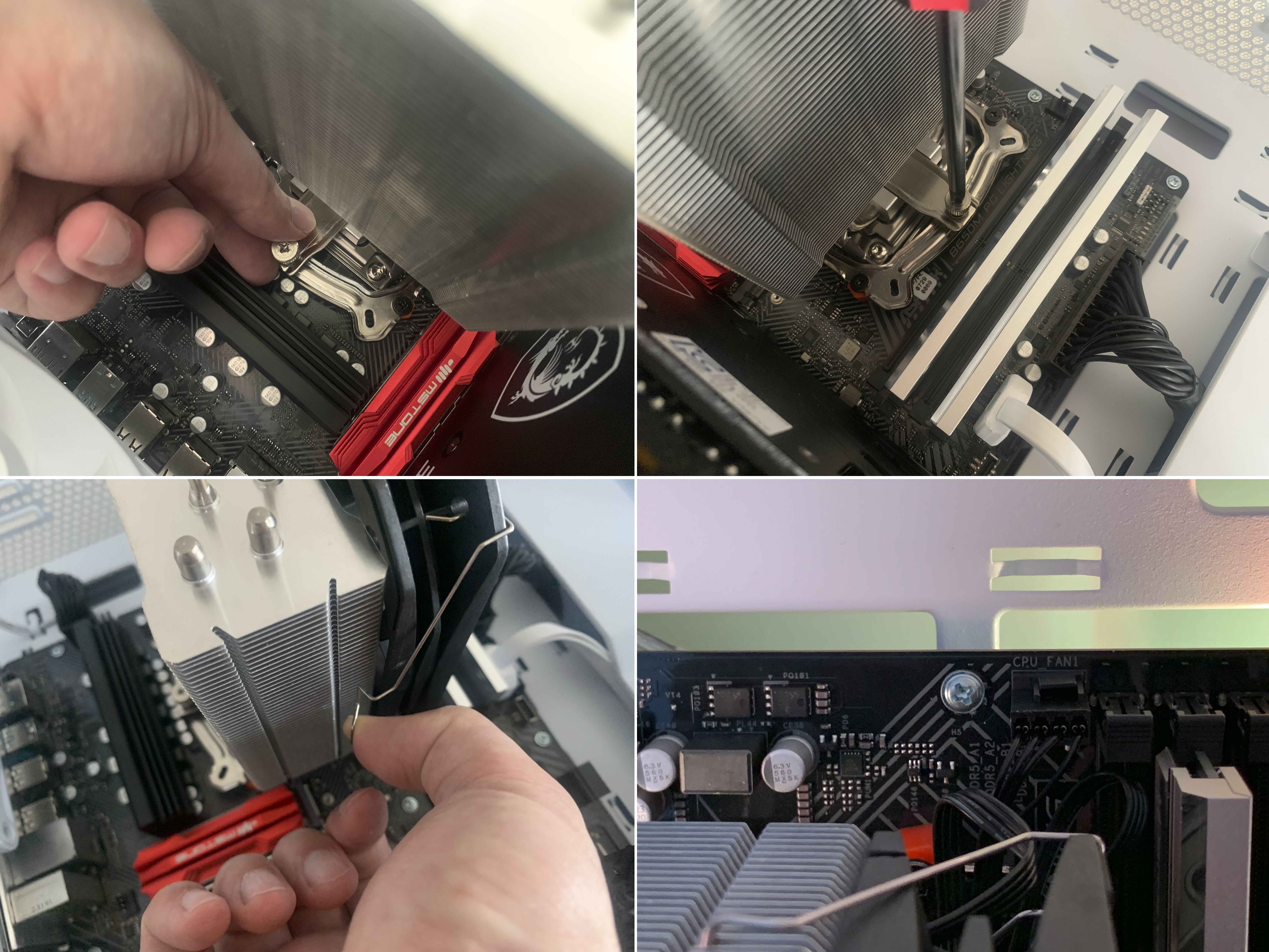 나사를 2회~3회 번갈아 가면서 조여가며 고정시킵니다. 팔라딘 400은 손으로 돌려 고정할 수 있기 때문에, 다른 공랭쿨러 대비 처음 설치하시는 분들도 쉽고 편리하게 조립이 가능합니다. 팬을 설치하고, 메인보드의 CPU FAN 헤더를 연결하여 설치를 마무리합니다.