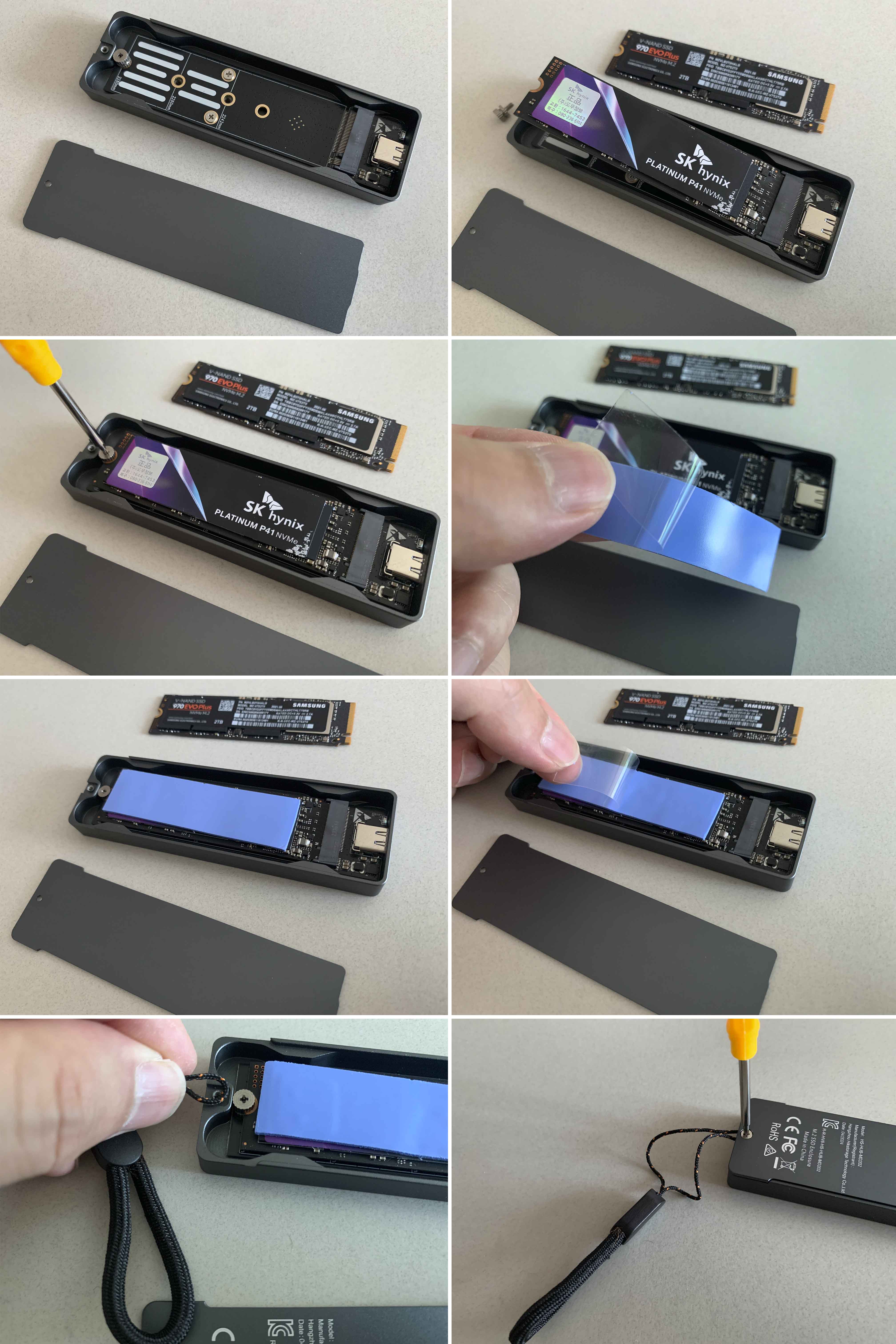 외장케이스, C-C와 C-A케이블, 케이스 고리, 써멀패드, 여분의 나사와 정밀 드라이버가 포함되어 있습니다.