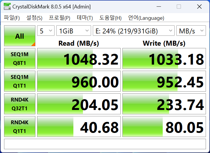 컴퓨터 C타입에 설치하고, 크리스탈디스크마크를 실행한 결과입니다.