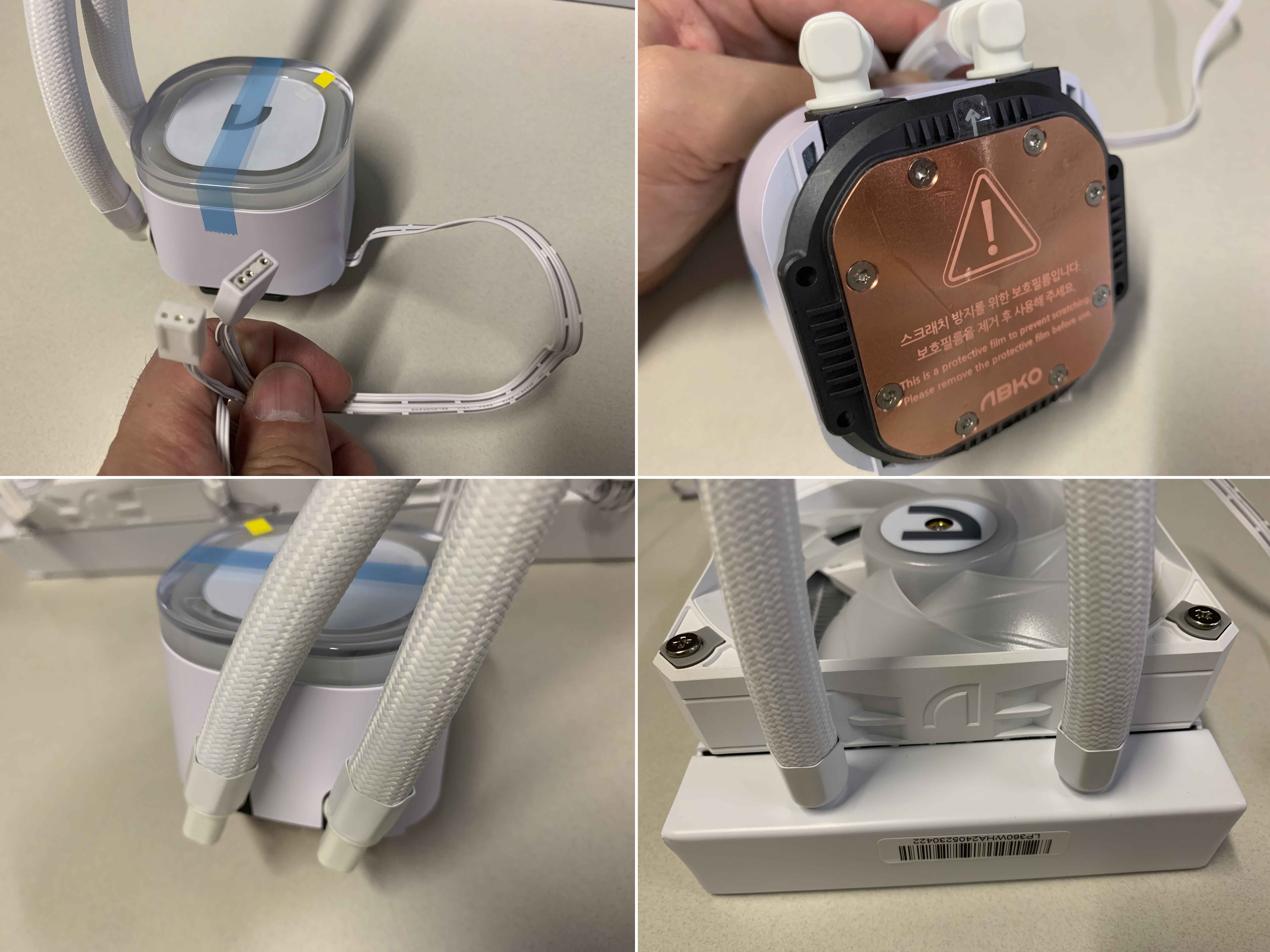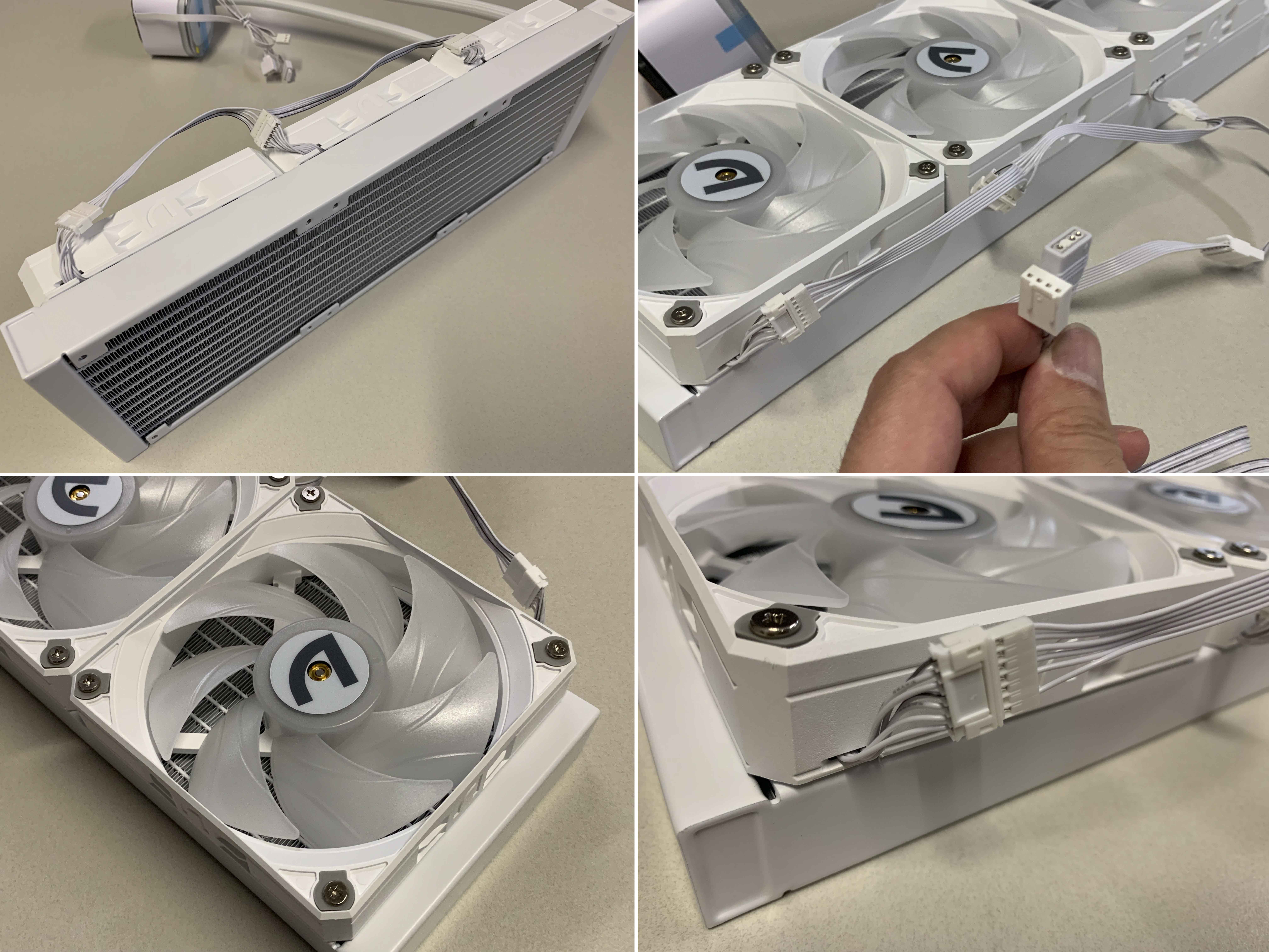 라디에이터와 팬이 결합되어 있어서, 쿨링 팬을 조립하는 과정없이 조립이 간편합니다. 쿨링팬이 케이블이 데이지 체인 방식이라 케이블이 단조로우며, 모든 케이블은 플랫케이블이라 깔끔하게 정돈 느낌입니다.