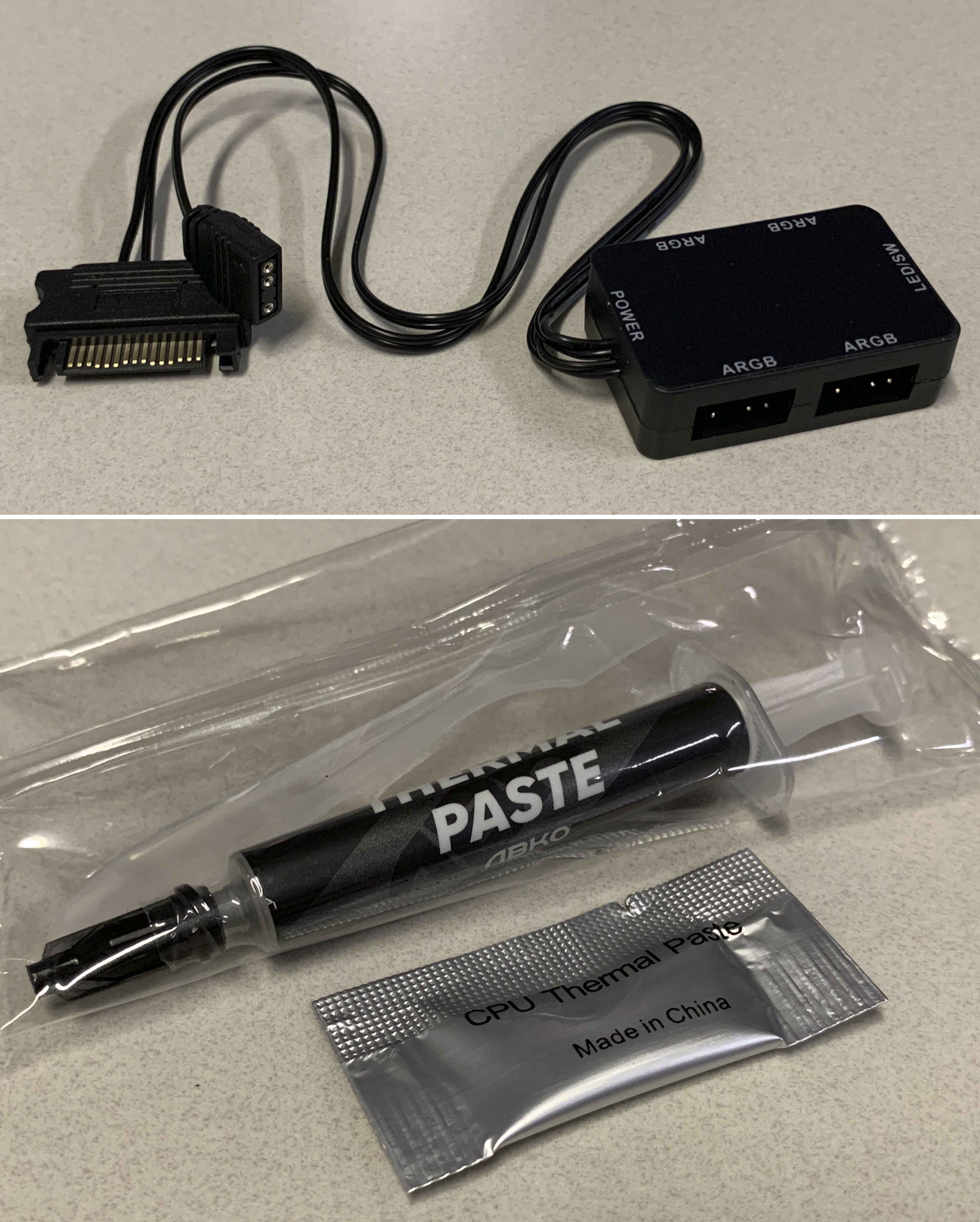 최근 출시되는 메인보드는 보급형이라도 대부분 3핀 5V ARGB 포트가 2개이상 있는 경우가 많아서, ARGB 팬 허브가 없어도 충분히 설치가 가능하지만, 어항케이스처럼 쿨링팬을 많이 사용할 경우 포트가 부족할 수 있는 점을 고려해 패키지에 포함시킨 친절함이 감사하게 느껴집니다. 포장 실수인지는 모르겠지만, 주사위형 써멀 구리스와 비닐로 포장된 써멀 구리스2종이 포함되어 있는데, 부족한것보다는 나으니 기분은 좋습니다. 써멀 구리스의 점도나 열전도성 등 스펙이 확인이 안되는 점은 조금 아쉽습니다.