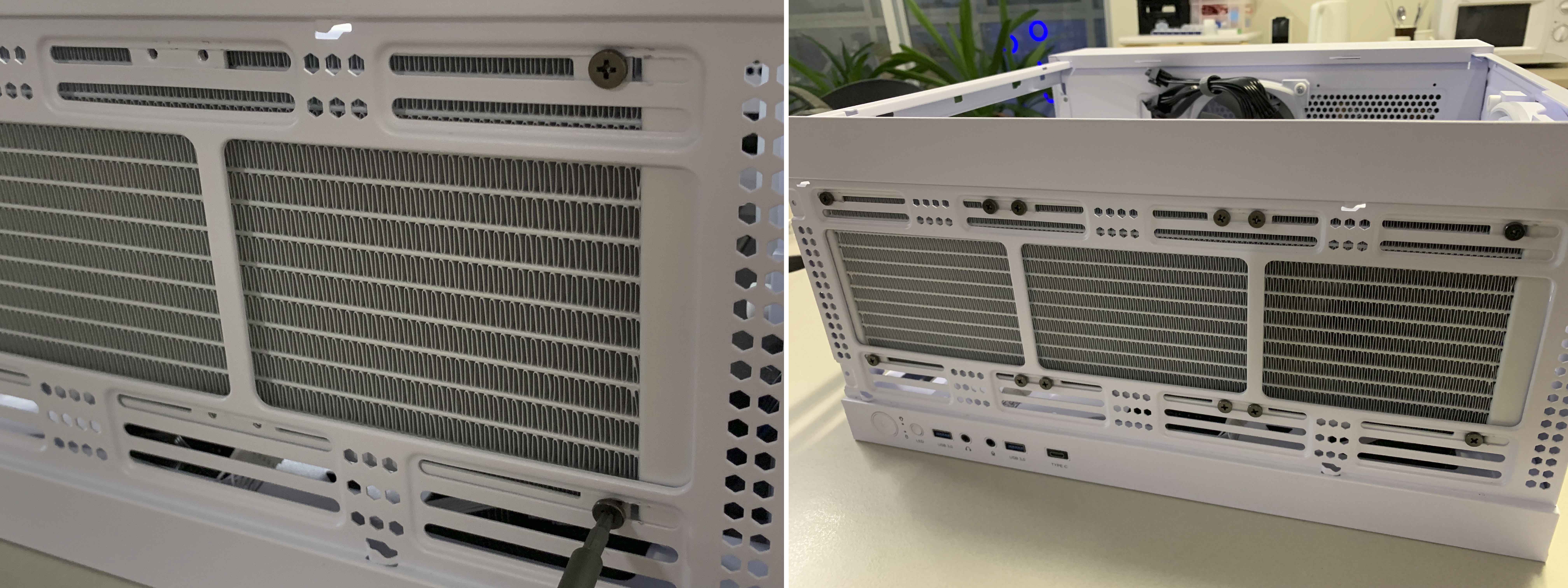 머리가 크고 길이가 짧은 나사 12개로 라디에이터를 케이스에 고정합니다.