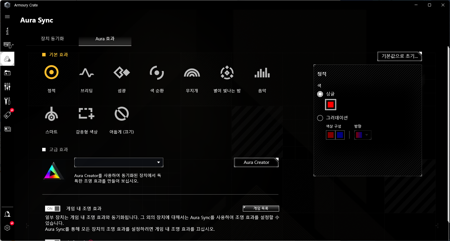 메인보드에서 지원하는 소프트웨어 Aura Sync에서 취향에 맞게 팬의 색상을 멋지게 튜닝할 수 있습니다.