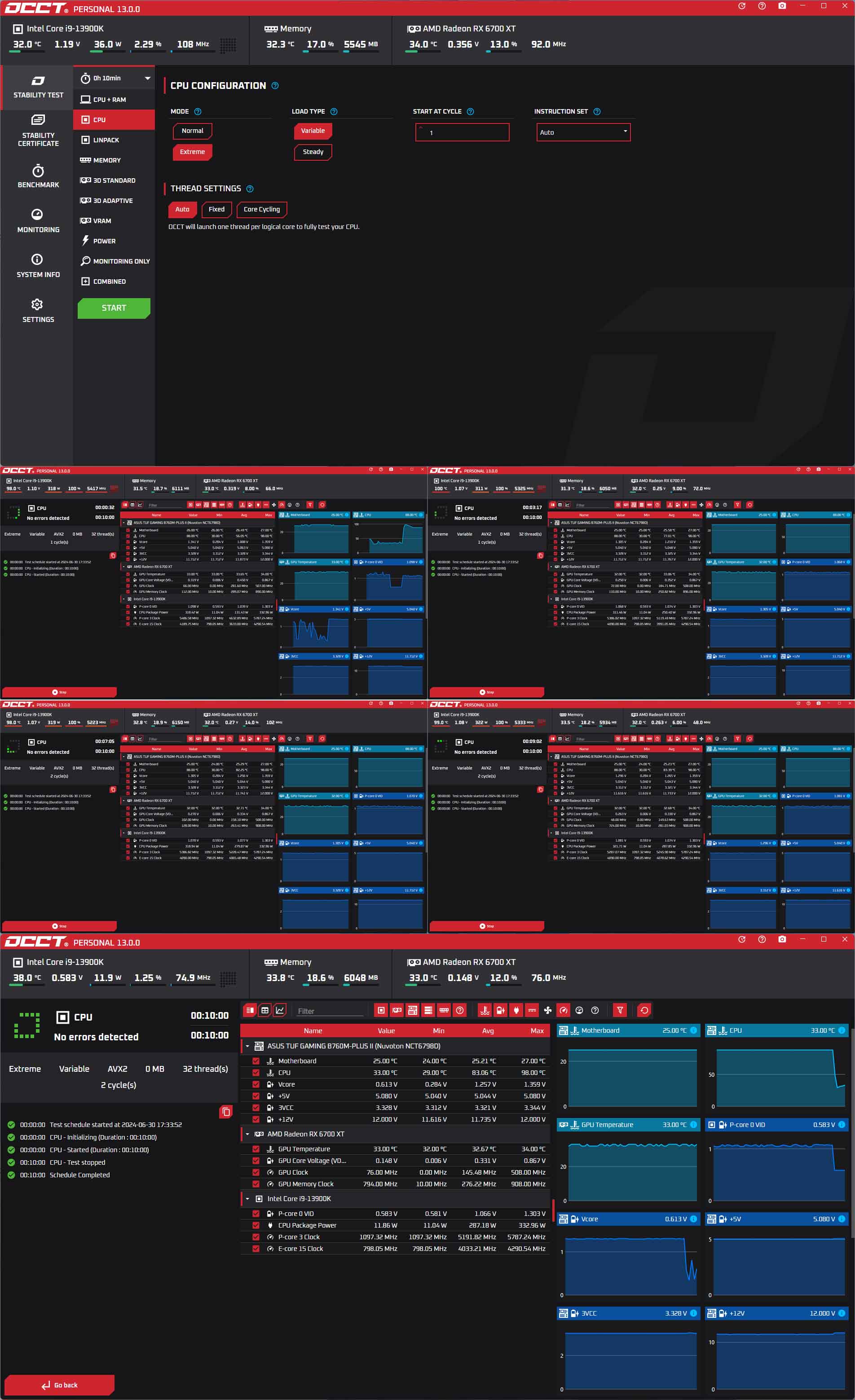 프로그램 OCCT에서 Extreme 모드로 10분간 CPU에 부하를 주었을때 안정적으로 실행되는 모습입니다.