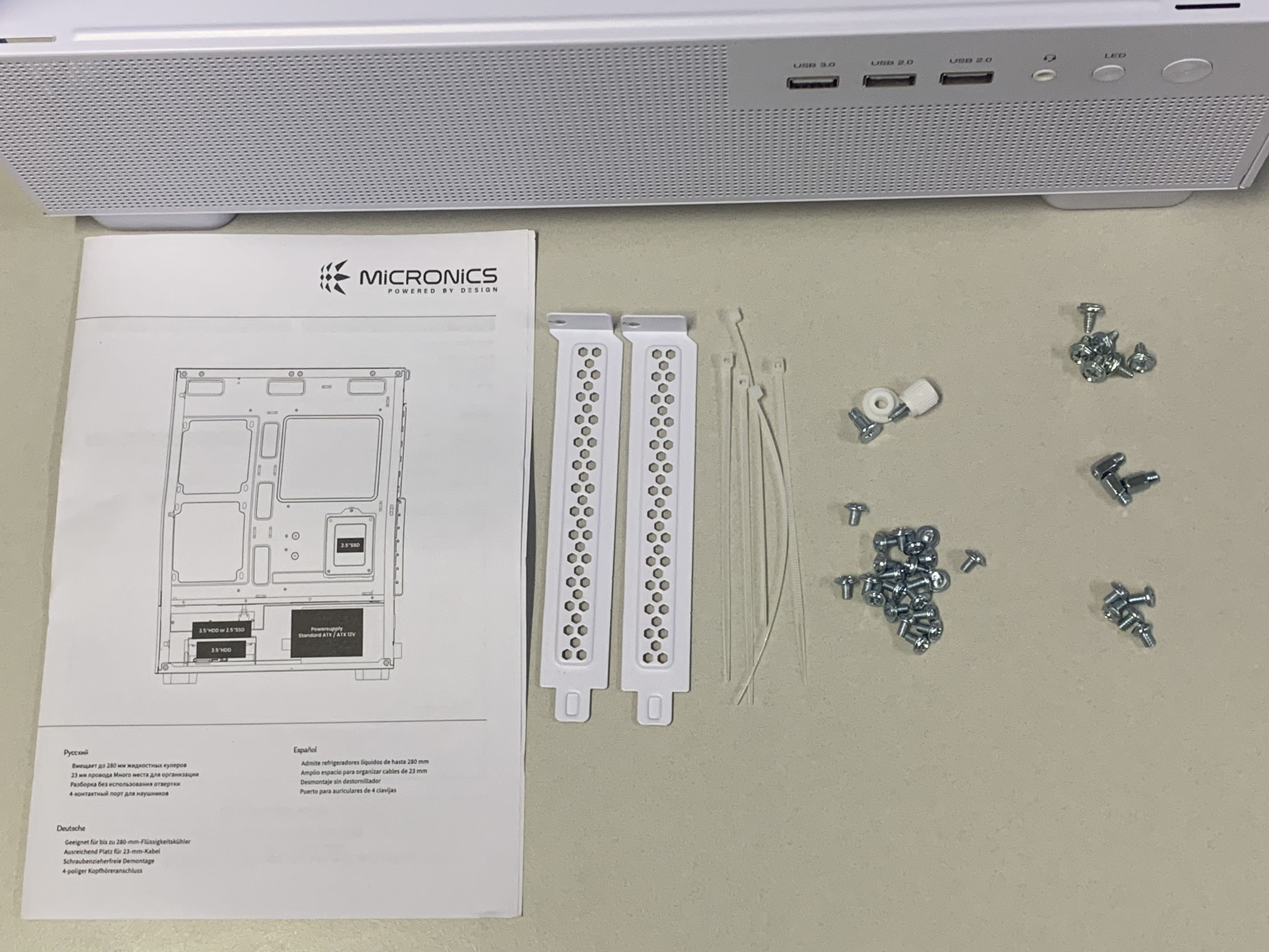 전체 구성품은 마이크로닉스 COOLMAX 멜로디 View 케이스 본품, 가이드, PCI 슬롯 커버 2개, 조립에 사용되는 케이블 타이, 고정 나사 등이 포함되어 있습니다.