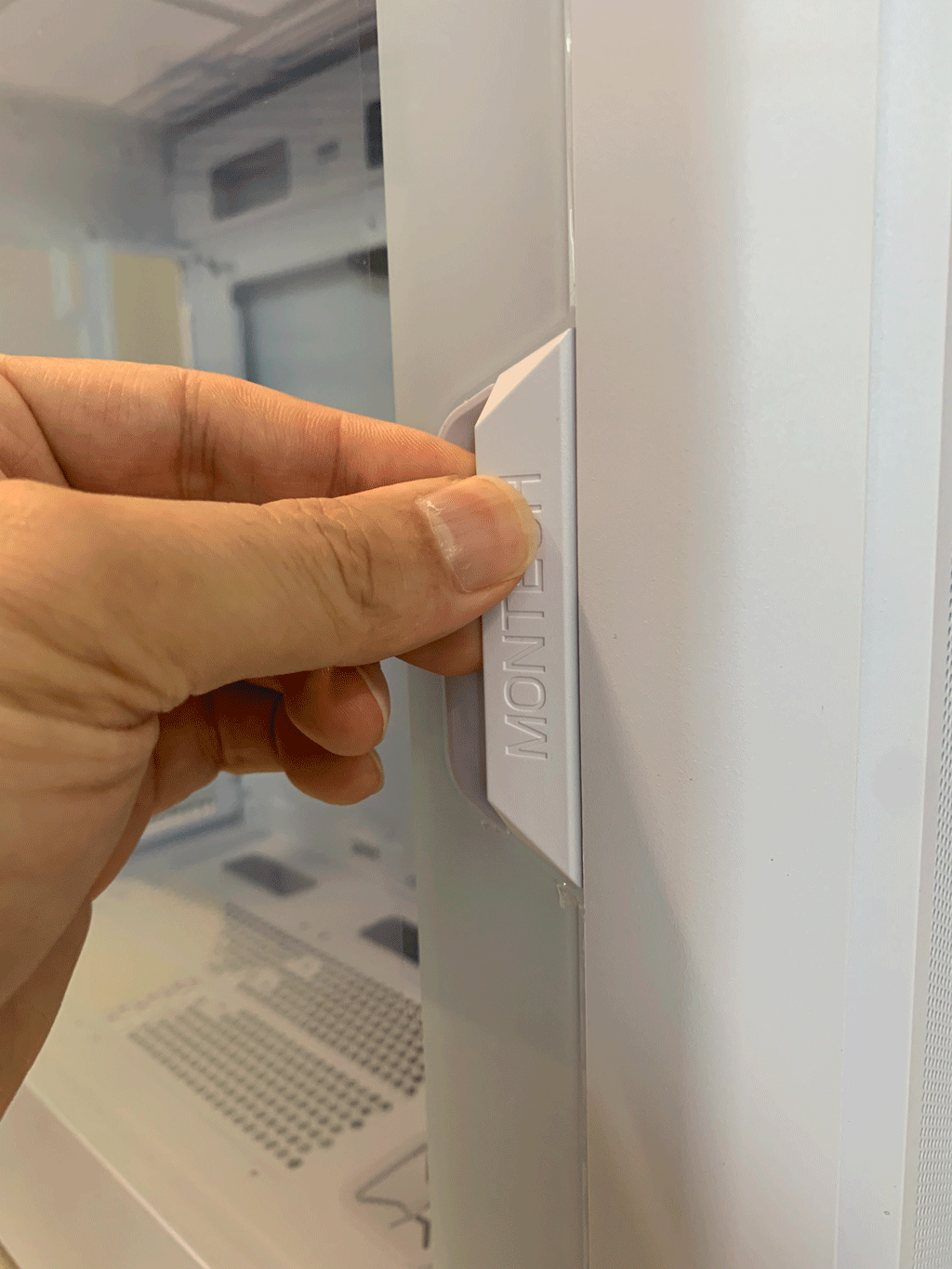 측면 강화유리는 스윙도어 방식이며, 강화유리는 약 3.8mm로 손으로 만져보면 묵직합니다.