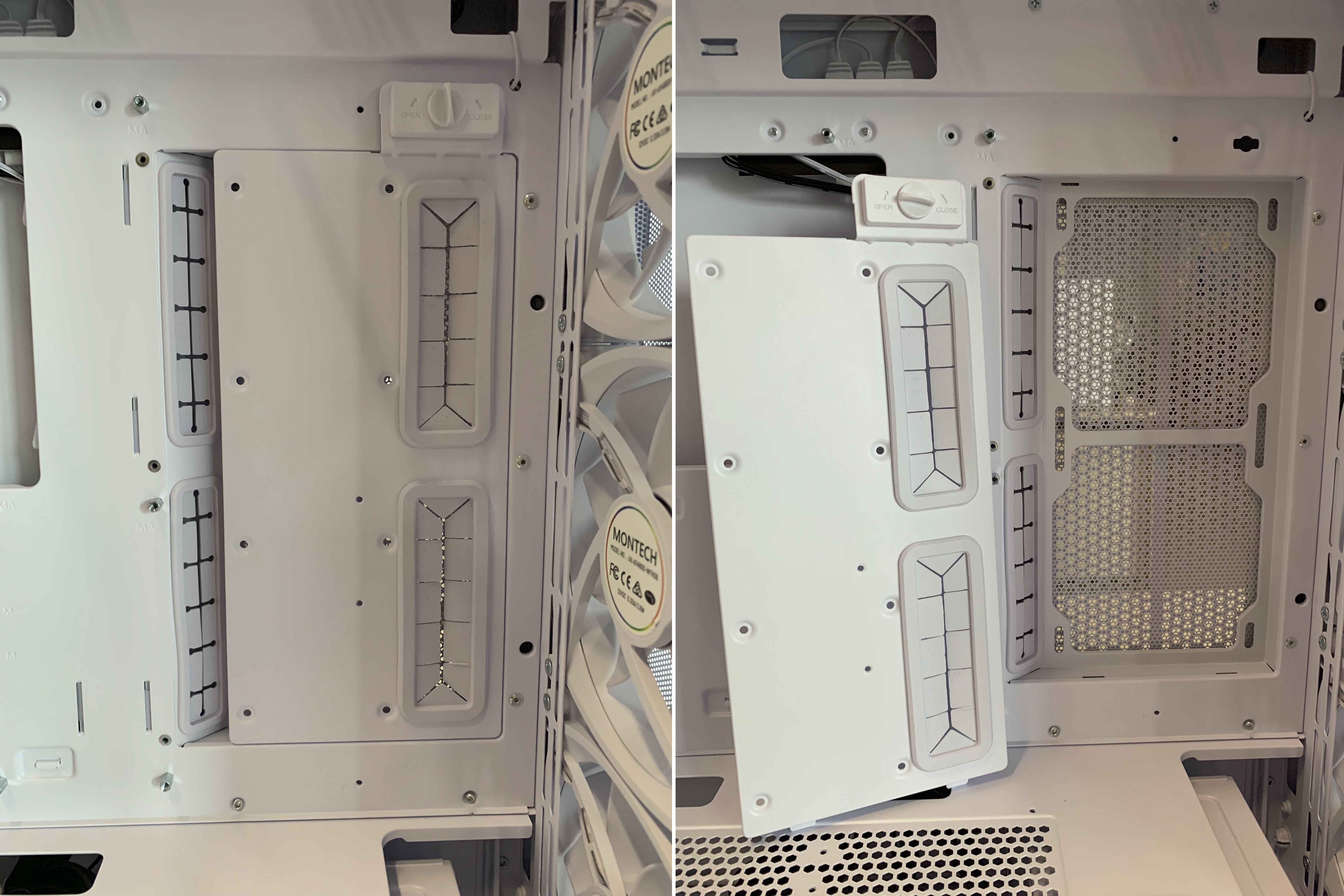 메쉬 스타일의 상단 패널은 손나사를 이용하여 도구 없이 쉽게 탈부착이 가능하며, 120mm x 3개 혹은 140mm x 2개 쿨링팬과 수랭쿨러를 설치할 수 있습니다. 상단 높이를 10mm 증가함으로써, 장착이 힘들었던 66mm 두께의 라디에이터와의 호환성이 개선되어 대부분의 수랭쿨러를 설치가 가능합니다.