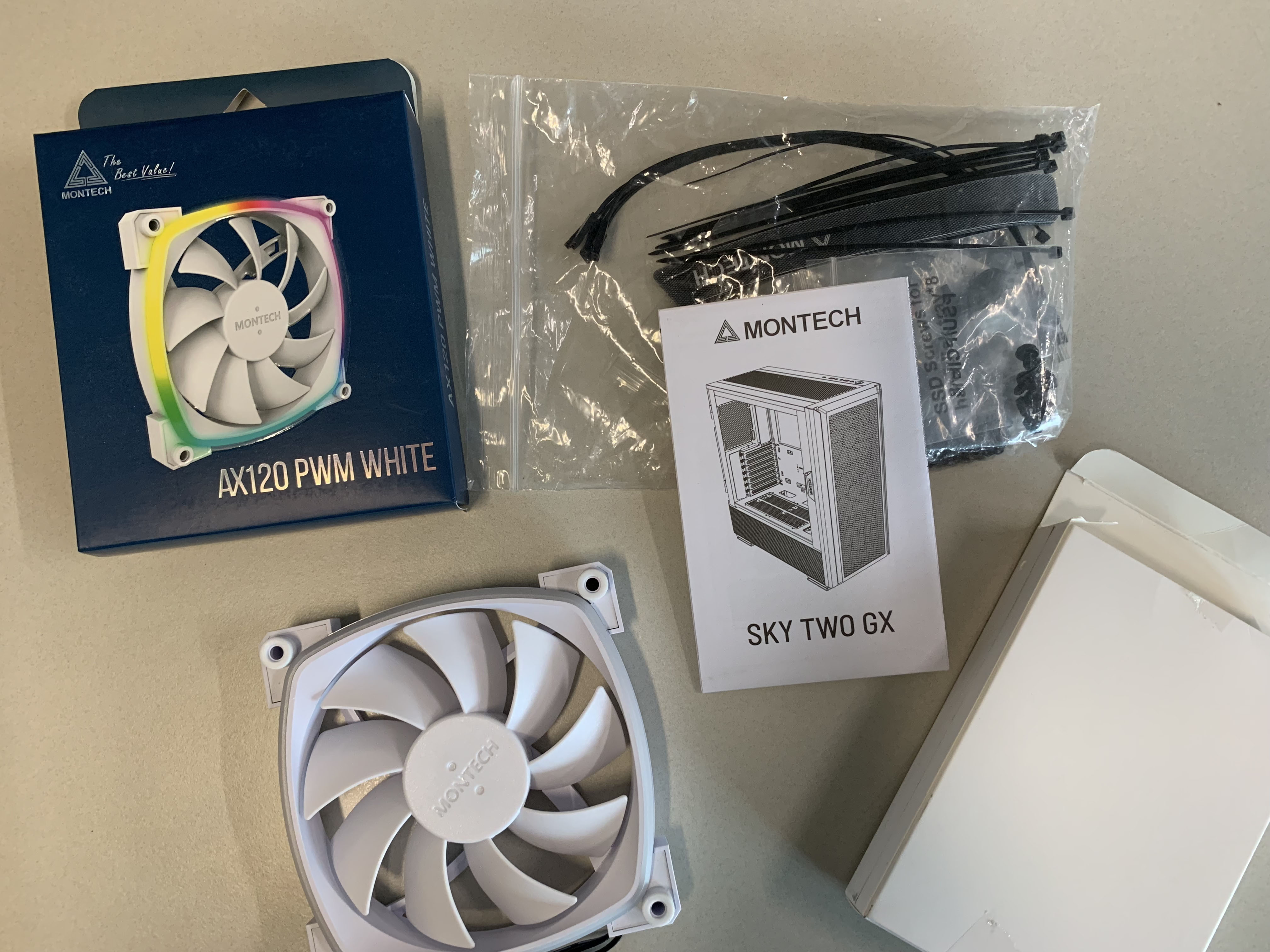 전체 구성품은 MONTECH SKY TWO GX 케이스 본품, 후면 쿨링팬, 가이드, 조립에 사용되는 케이블 타이, 고정 나사 등이 포함되어 있습니다.