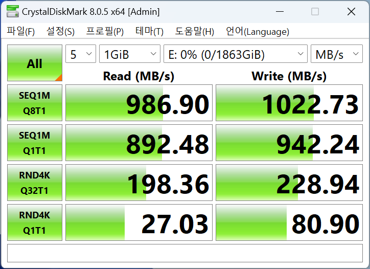 10Gbps를 지원를 USB TYPE-C에 외장 SSD를 설치하고, 크리스탈 디스크마크 프로그램으로 측정한 결과이며 대용량 데이터를 옮기는 일이 잦더라도 쾌적하게 사용할 수 있겠습니다.