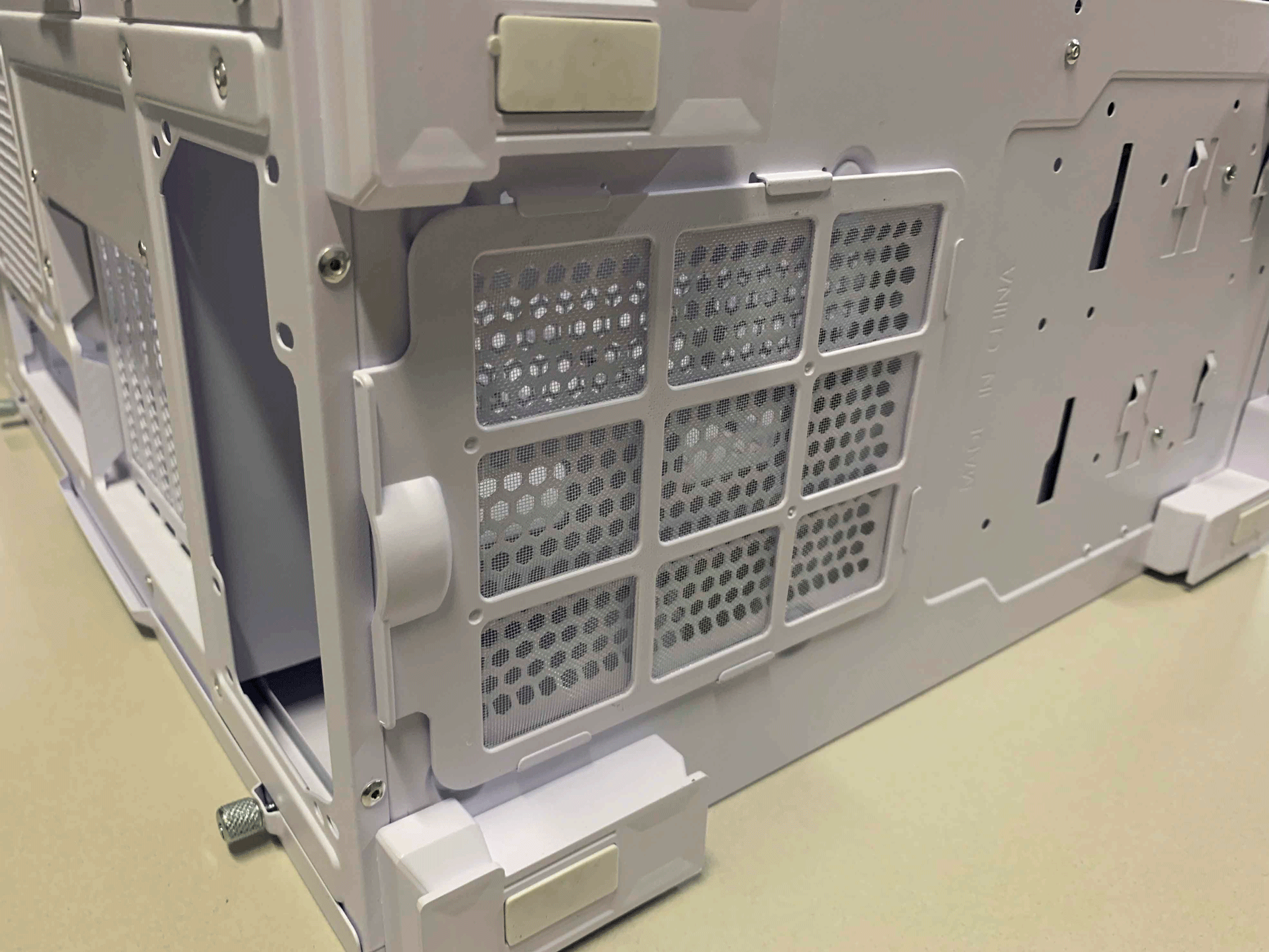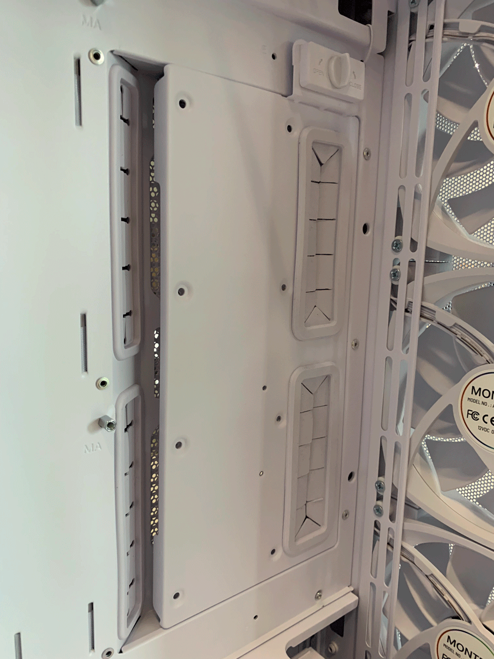 PCI 슬롯은 7개이며 모두 재사용이 가능하며 손나사(핸드스크류)로 고정할 수 있습니다. 하드베이 또한 손나사를 사용할 만큼 MONTECH SKY TWO GX의 고급스러움을 느낄 수 있습니다. 하단에는 미끄럼 방지패드와 슬라이딩 방식의 먼지 필터를 확인할 수 있습니다. 하드베이는 사용하는 환경에 따라 위치를 옮길 수 있습니다.