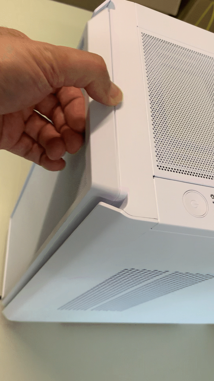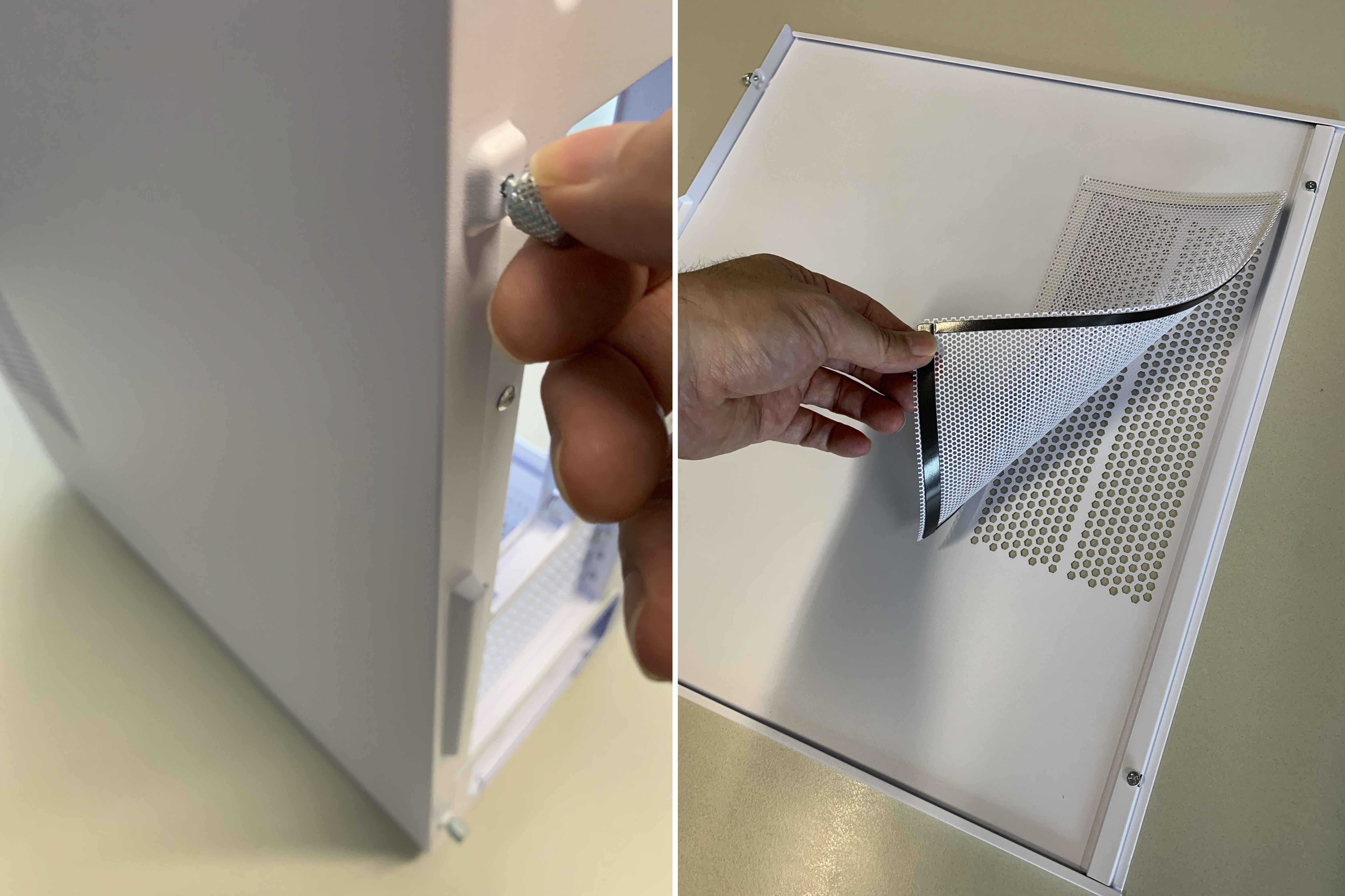 메쉬 패널은 자석식으로 힘들이지 않고 손으로 살짝 당기면 손쉽게 탈부착이 가능합니다. 흡기로 인해 먼지가 많이 유입되는 곳인데 청소할때 편리합니다.