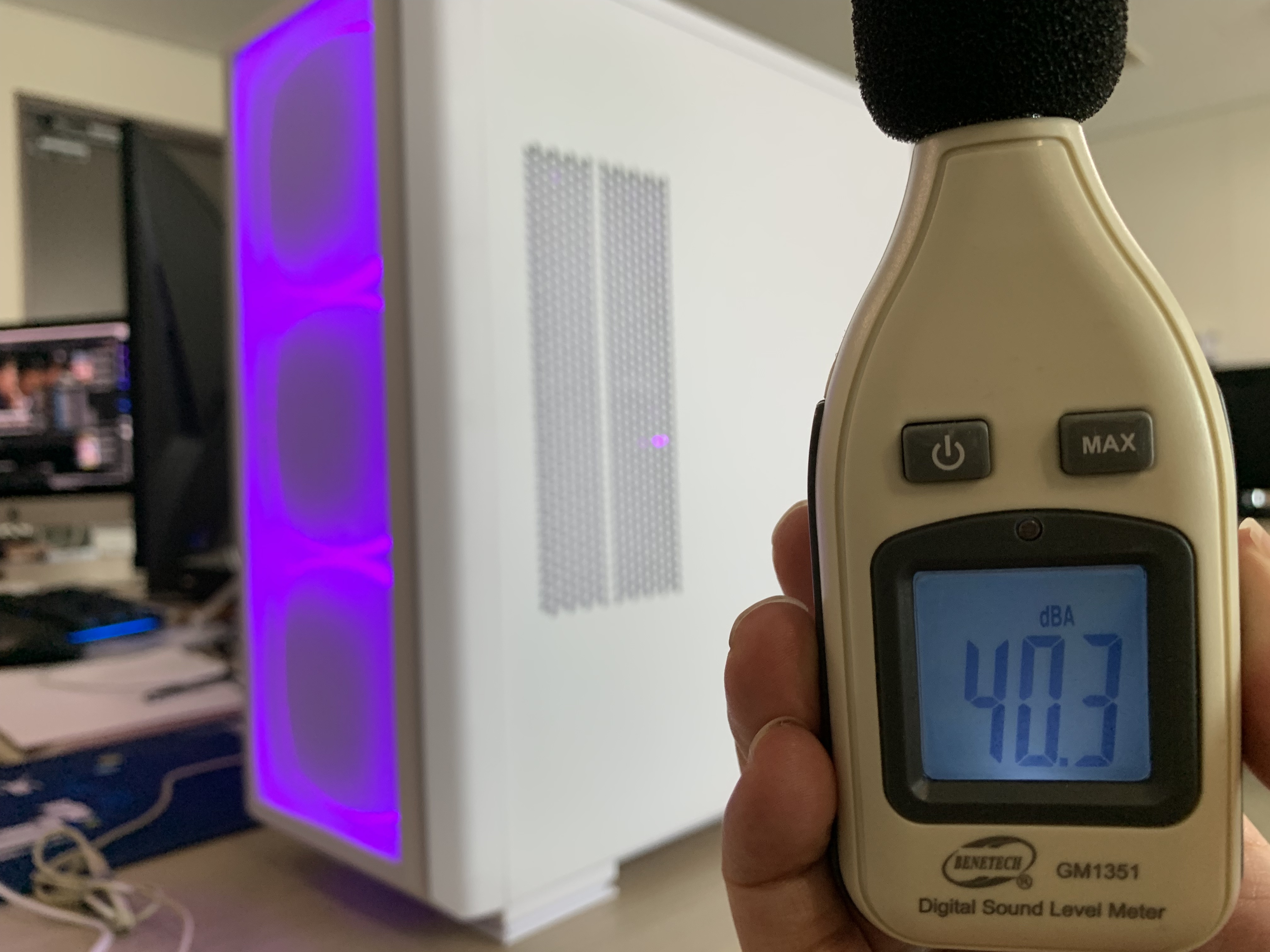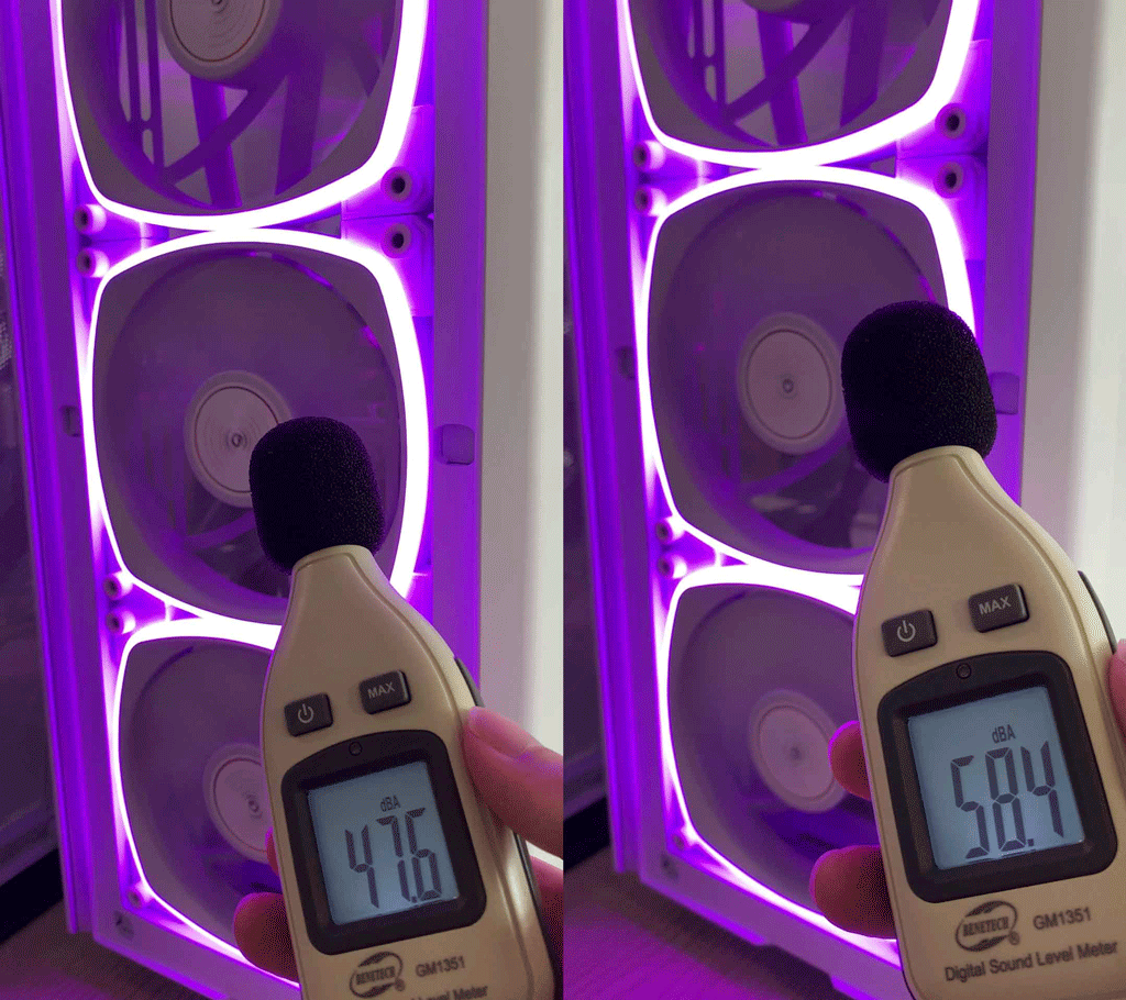 컴퓨터에서 떨어진곳에서 측정면 약 39~41dBA가 측정되는 환경에서, 대기상태일때 약 48dBA와 풀로드 상태일때 약 58dBA의 소음이 측정되었습니다. 대기상태일때는 거의 무소음에 가까울 정도로 정숙하고, 과부하의 풀로드 상태에서도 큰 소음은 발생하지 않으며 귀에 거슬리는 소음 또한 전혀 발생하지 않았습니다. 풍압 및 풍량등은 별도의 장비로 확인하지 않았지만 140mm 팬 3개의 성능은 케이스 내부에 손을 넣어 보면 실감할 수 있습니다.