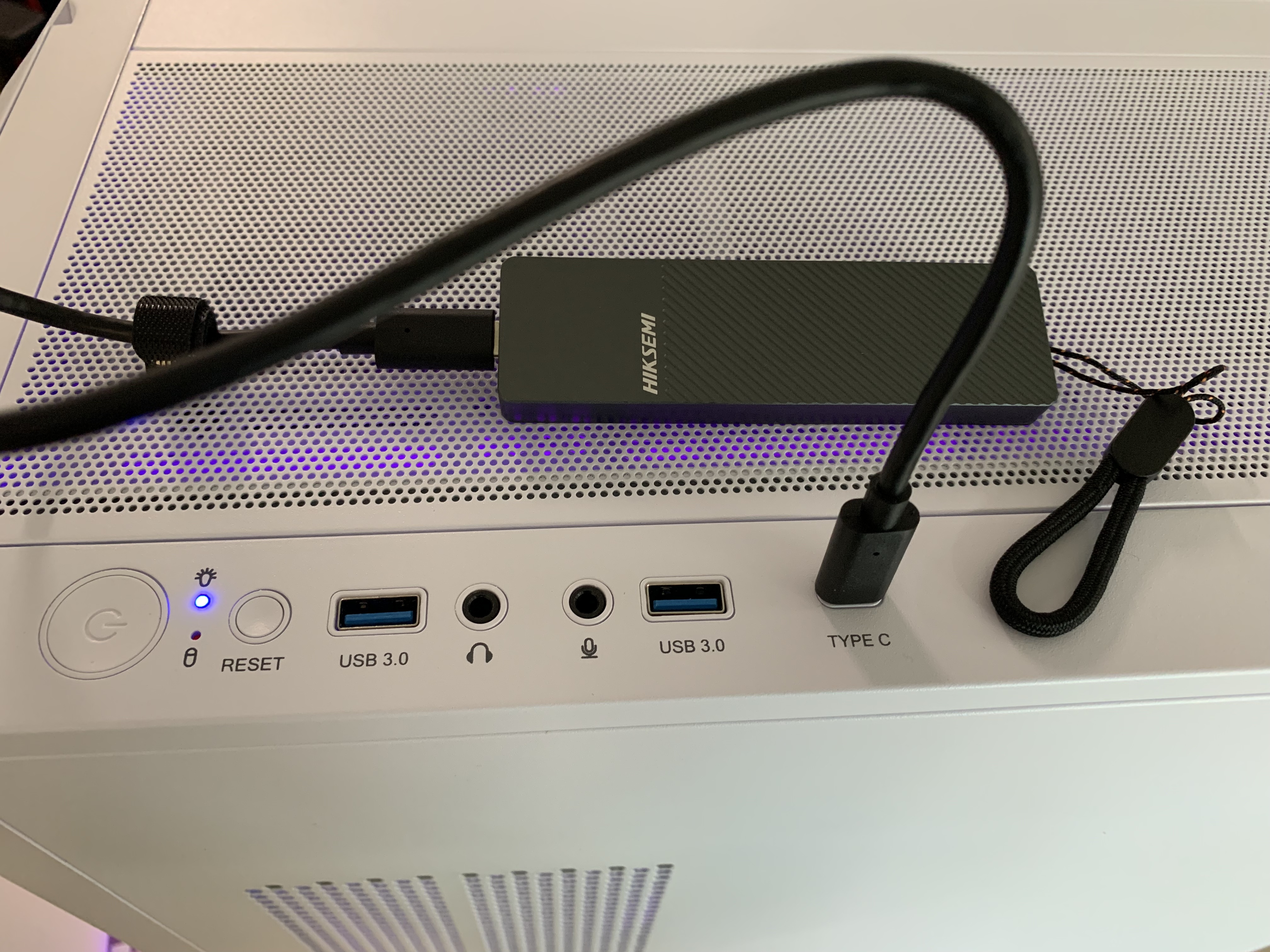 I/O 인터페이스는 좌측에서 전원 버튼, 상태 표시 LED, 리셋 버튼, USB 3.0 TYPE-A, 헤드셋 / 마이크 잭, USB 3.0 TYPE-A, USB 3.1 TYPE-C 등으로 구성되어 있습니다.