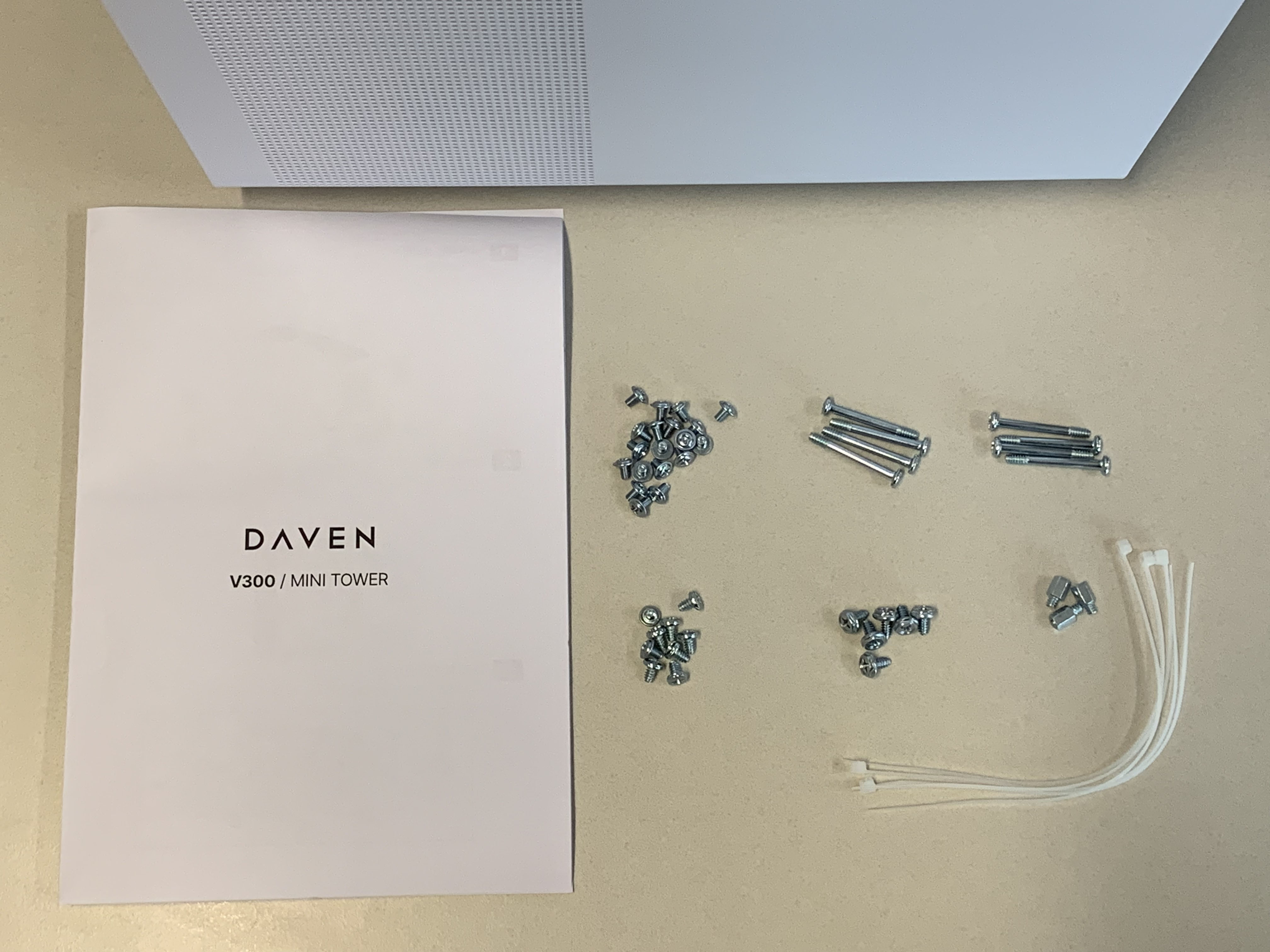 전체 구성품은 DAVEN V300 케이스 본품, 가이드, 조립에 사용되는 케이블 타이, 고정 나사 등이 포함되어 있습니다.