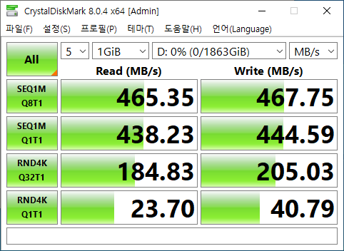 크리스탈 디스크마크 프로그램으로 벤치테스트시, USB3.0 TYPE-A와 USB3.0 TYPE-C는 동일한 속도 5Gbps로 측정되었습니다.
