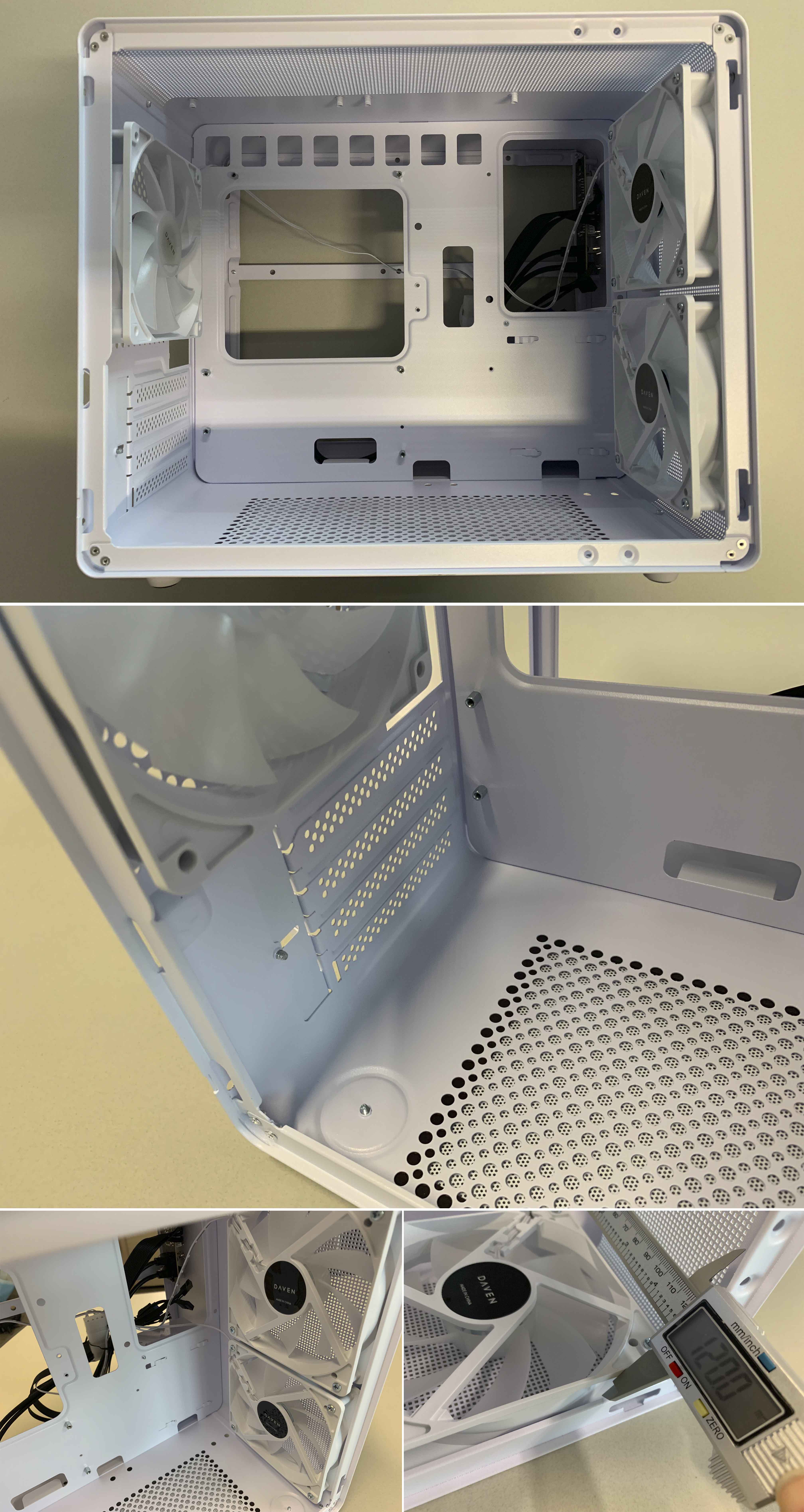 CPU 최대 높이 160mm, GPU 최대 길이 310mm(전면 팬 쿨러 미 장착시 340mm), PCI 슬롯 4개, 3.5" HDD 2개, 2.5" SSD 3개가 설치 가능합니다.