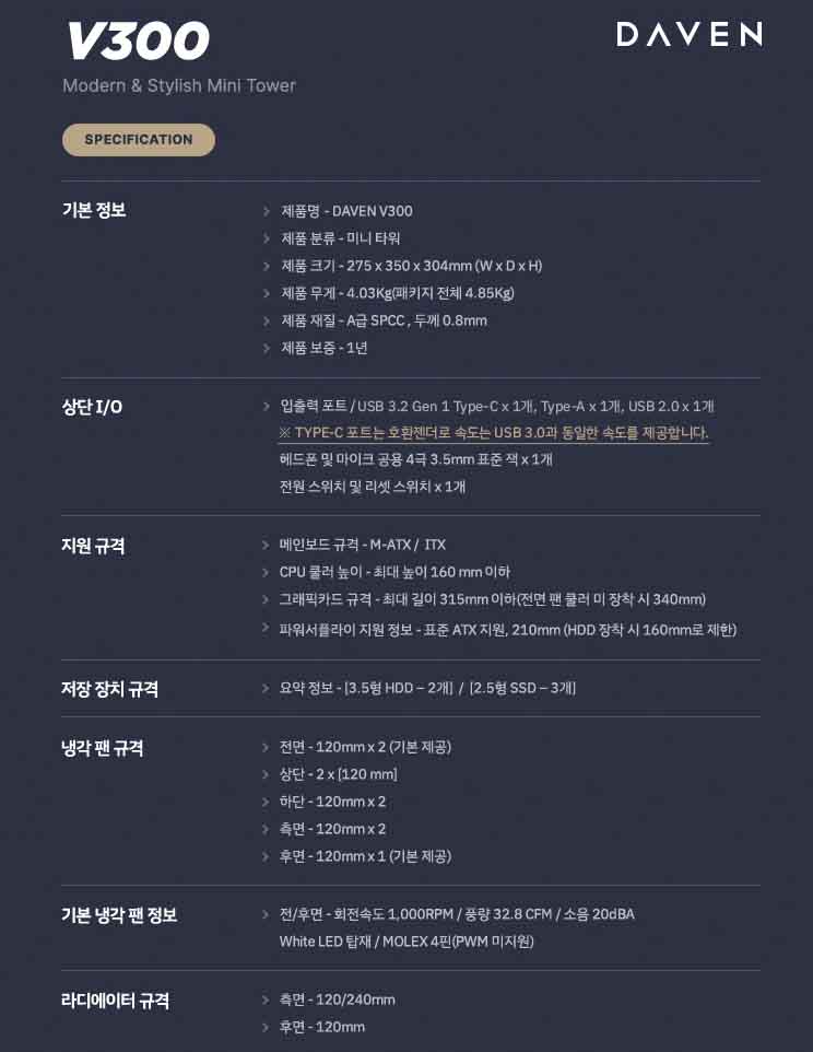 대중적으로 부담없이 구매가 가능한 M-ATX 폼팩트 메인보드와, ATX 파워서플라이 등의 주요 부품을 유지하고도 미니멀한 시스템을 만들 수 있어서, ITX 메인보드나 SFX 파워서플라이 등 고가의 비용 때문에 망설였던 분이라면 DAVEN V300으로 아기자기한 시스템을 만들어 보시는걸 추천드립니다.