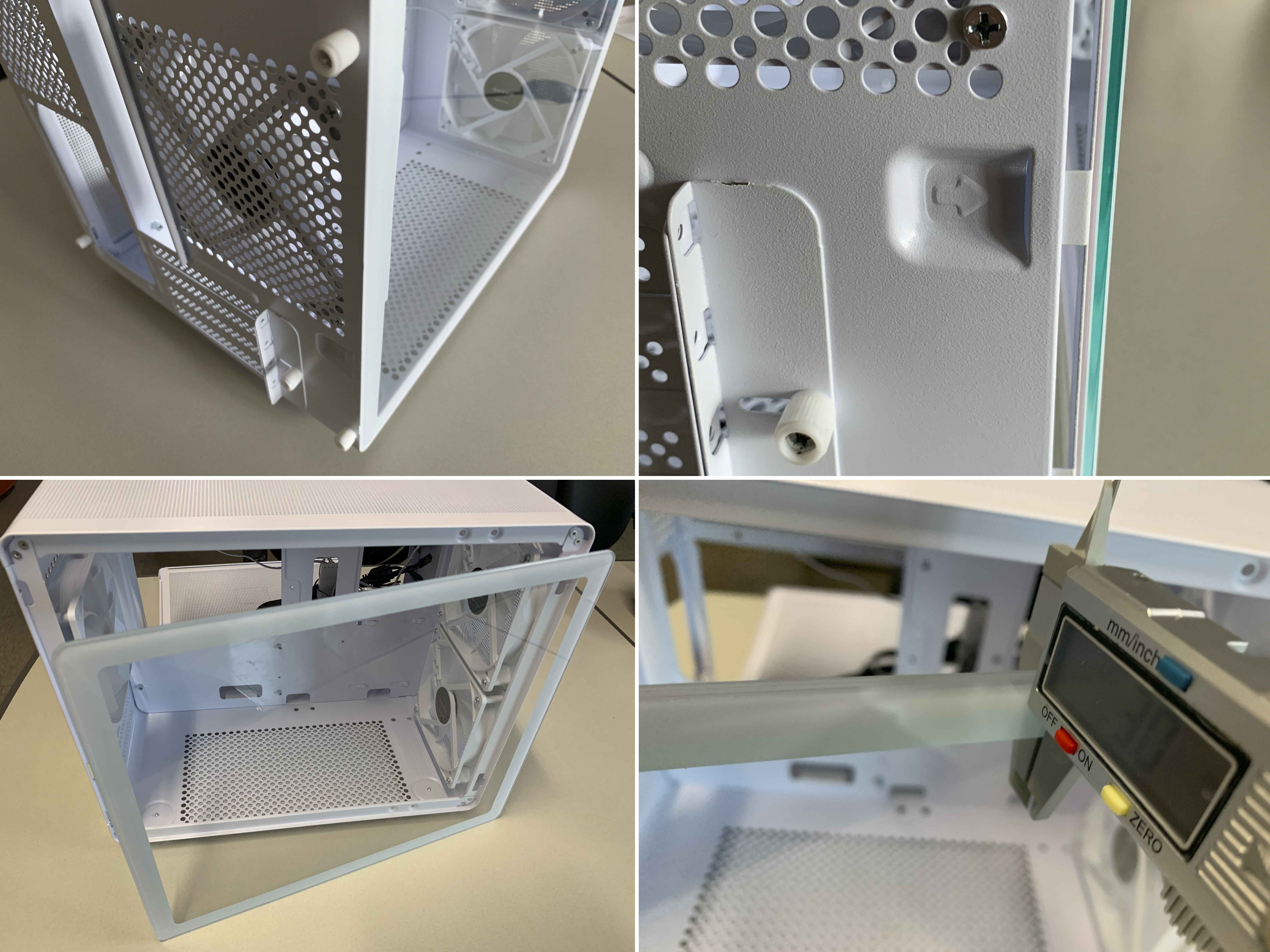 측면 강화유리는 시원한 개방감이 기대되며, 손나사로 고정하는 방식입니다. 손나사를 풀고, 화살표 방향으로 손가락으로 밀면 분리가 됩니다. 강화유리는 약 3mm로 측정되었습니다.