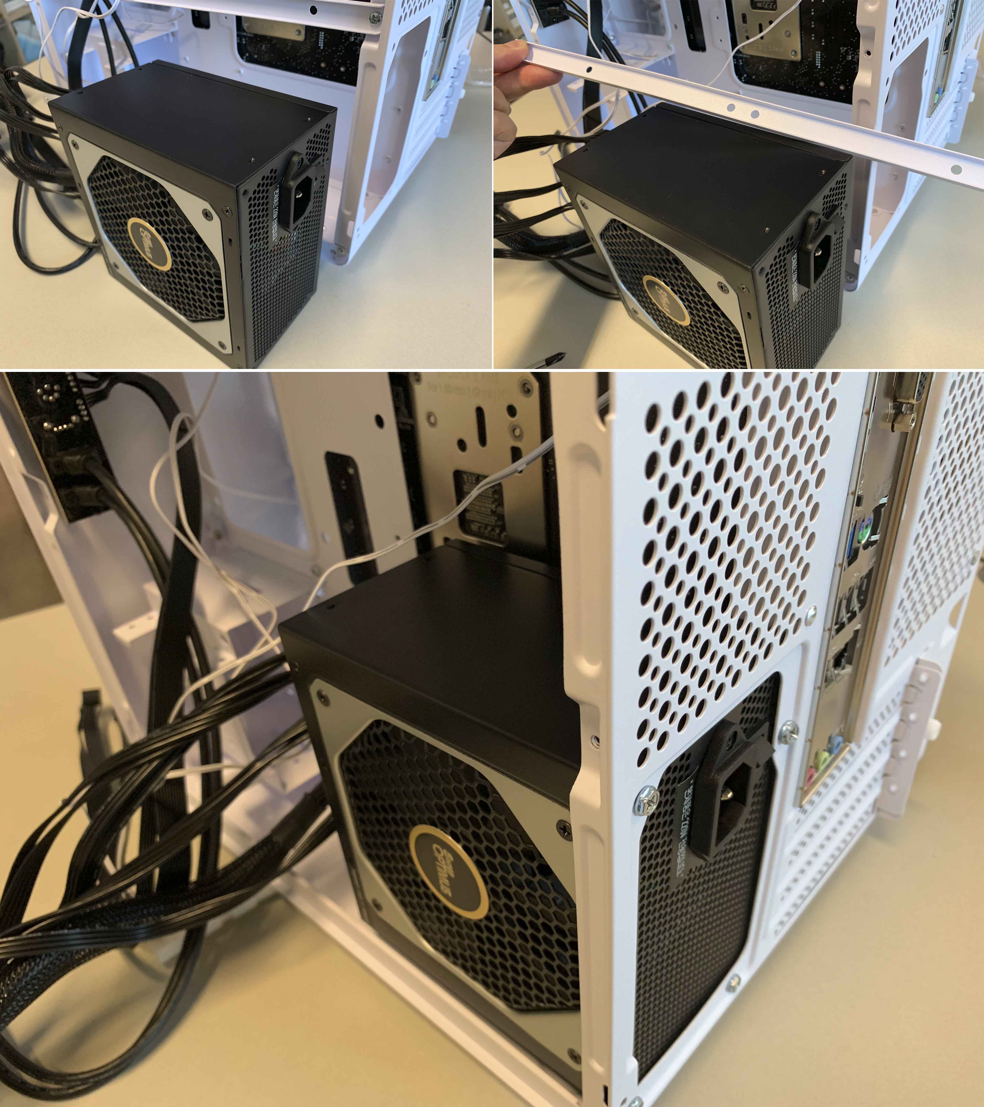 가늘고 긴 패널을 나사 2개로 풀어 제거한 후, 파워 서플라이를 설치했습니다.