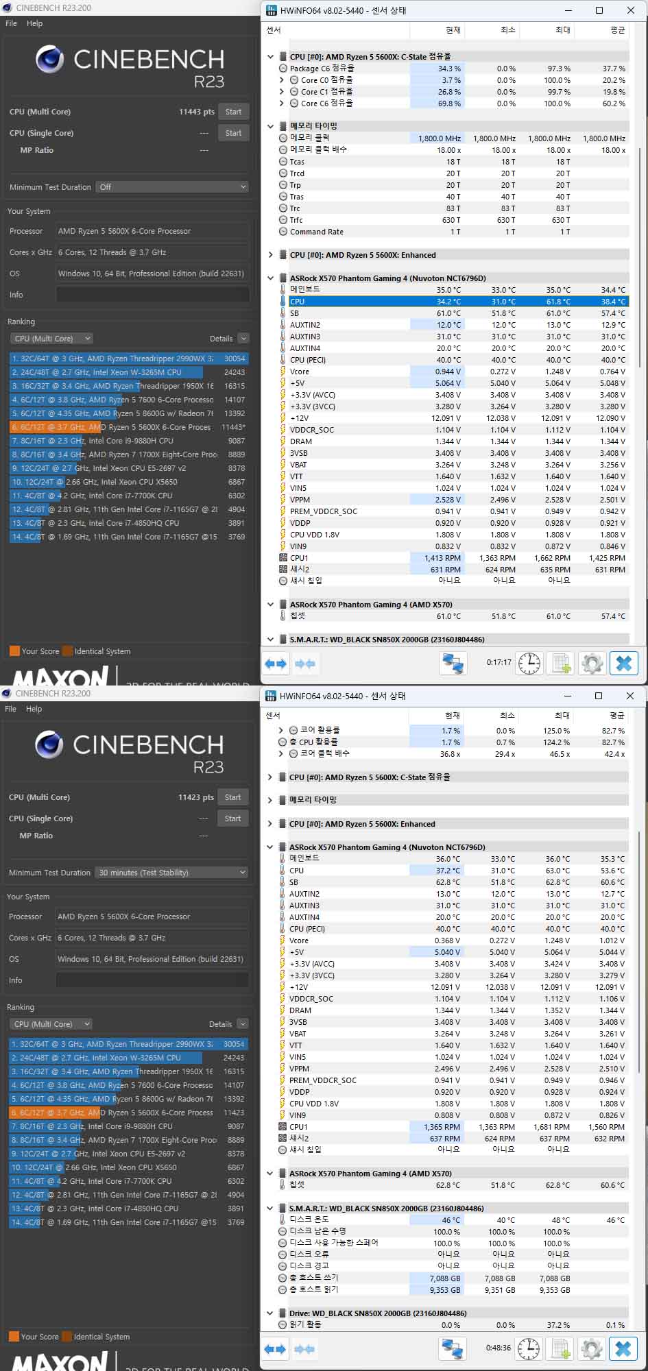 CINEBECH R23 프로그램에서 1회 실행과 30분 실행한 결과입니다.