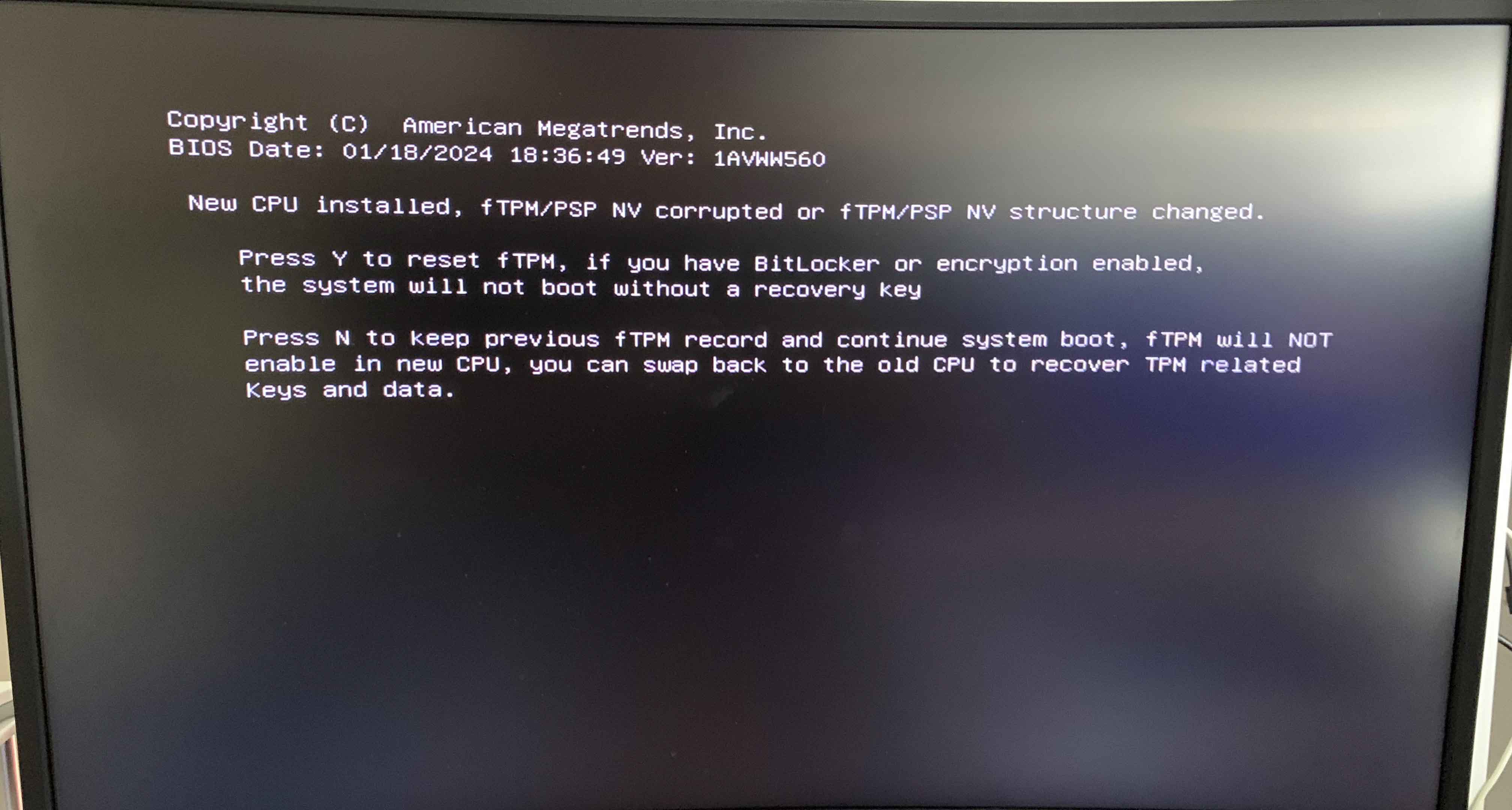 모든 조립을 완료하고 부팅합니다. 첫 부팅 성공시 fTPM관련 메세지가 보이는데 Y 누르고 컴퓨터를 사용하면 됩니다.
