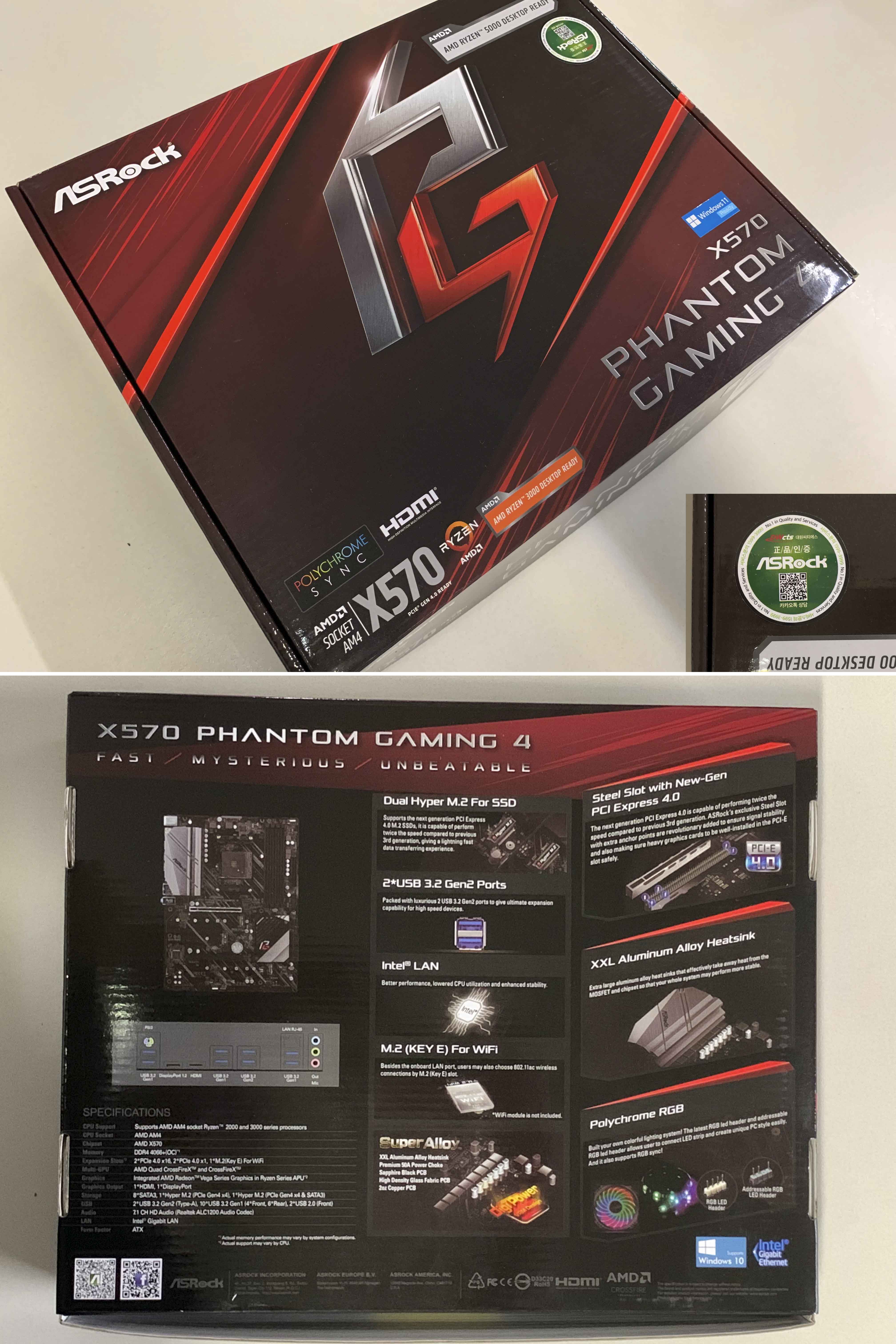 박스 앞면에는 대원씨티에스 ASRock 정품 인증 스티커가 붙어 있고, 뒷면에는 ASRock X570 Phantom Gaming 4 의 특징 과 스펙을 확인할 수 있습니다.