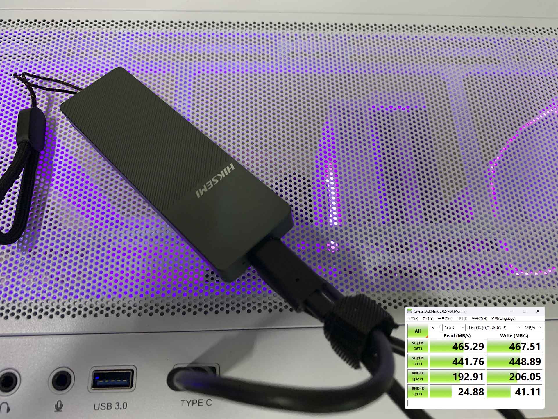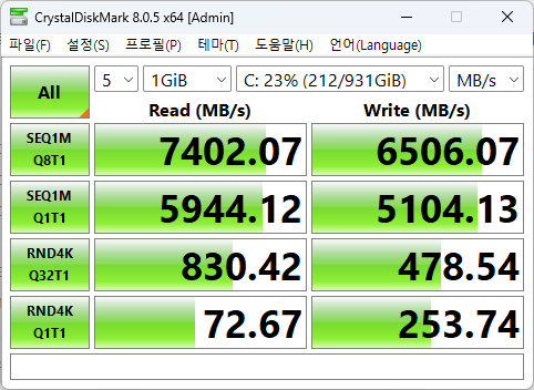 크리스탈디스크마크로 첫번째 슬롯에 장착한 SK하이닉스 Platinum P41 M.2 NVMe 1TB 실행한 결과와 전면 USB3.2 Gen1 Type-C 에서 측정한 결과입니다.