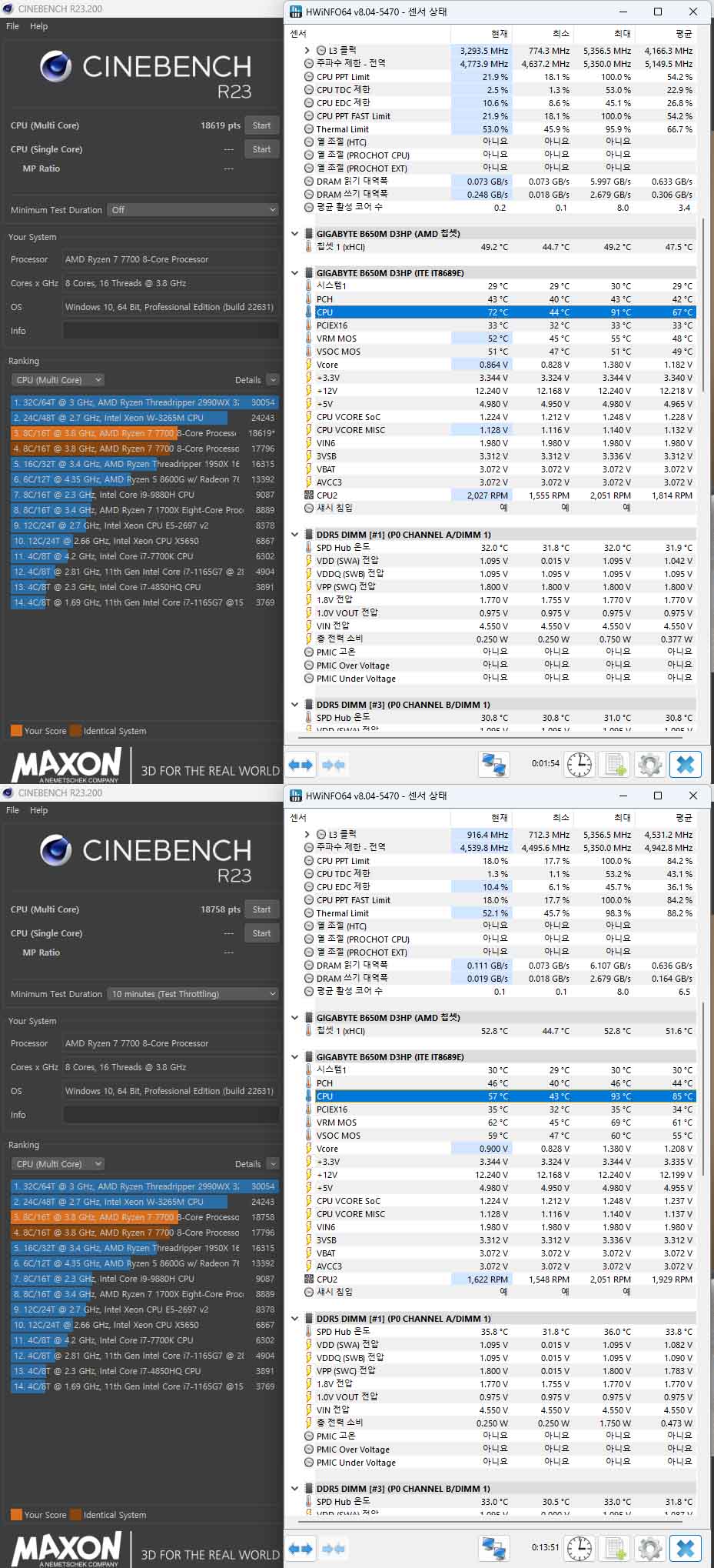 CINEBECH R23 프로그램에서 1회 실행과 10분 실행한 결과입니다.