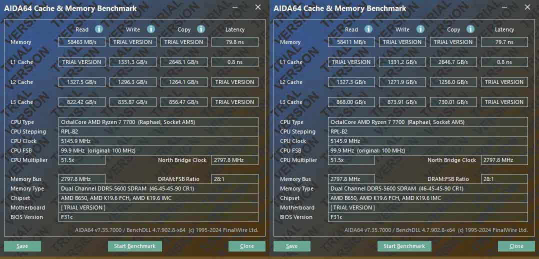 벤치테스트 2번 실행시, 싱글/멀티는 각각 750.5점 / 7766.1점과 749.9점 / 7757.6점이 측정되었습니다.AIDA64을 두번 실행한 결과 레이턴시는 79.8ns / 79.7ns 로 측정되었습니다.