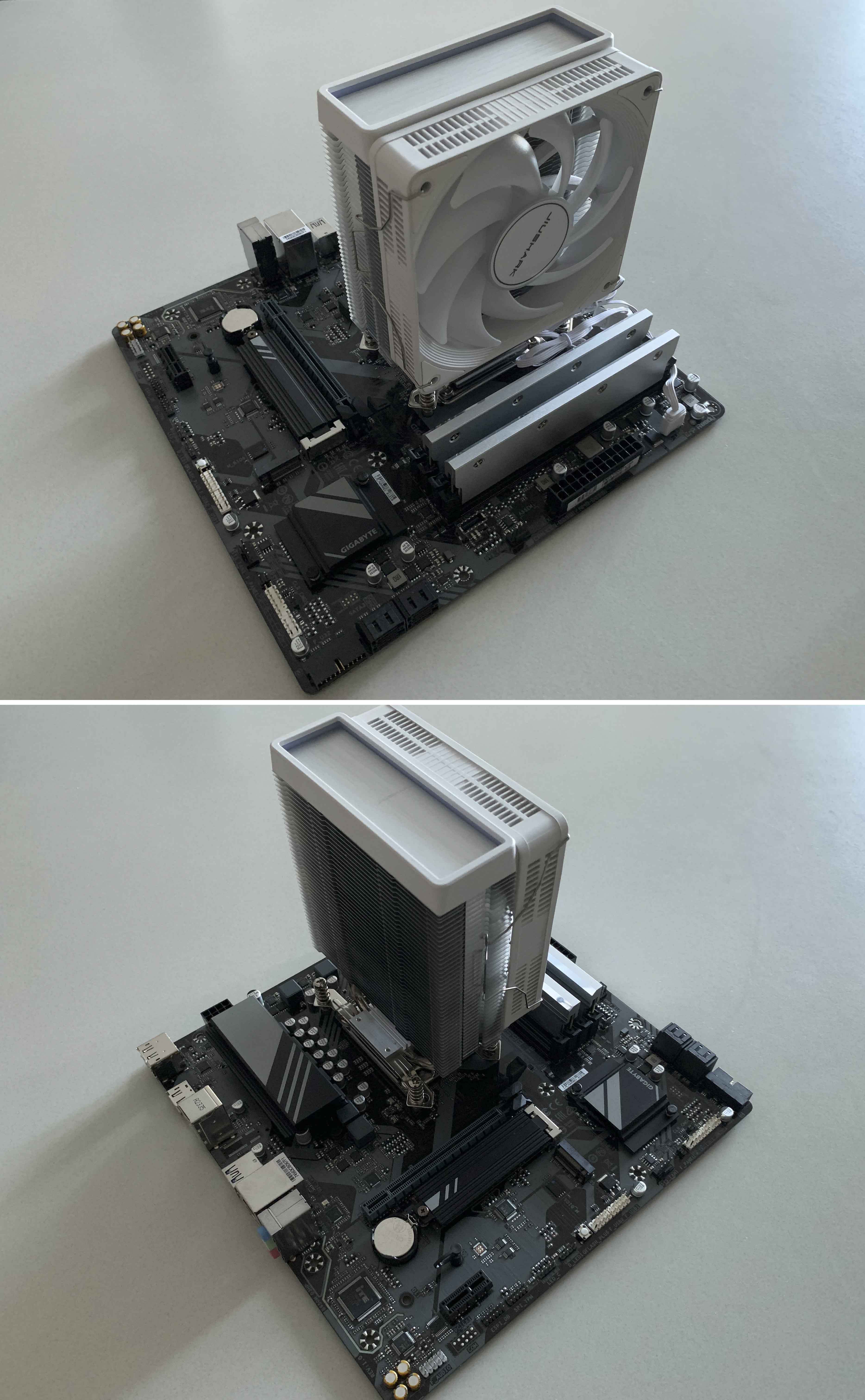 써멀컴파운드는 9개의 점으로 도포하고, CPU쿨러 JIUSHARK JF120 Emerald ARGB 화이트를 설치합니다.