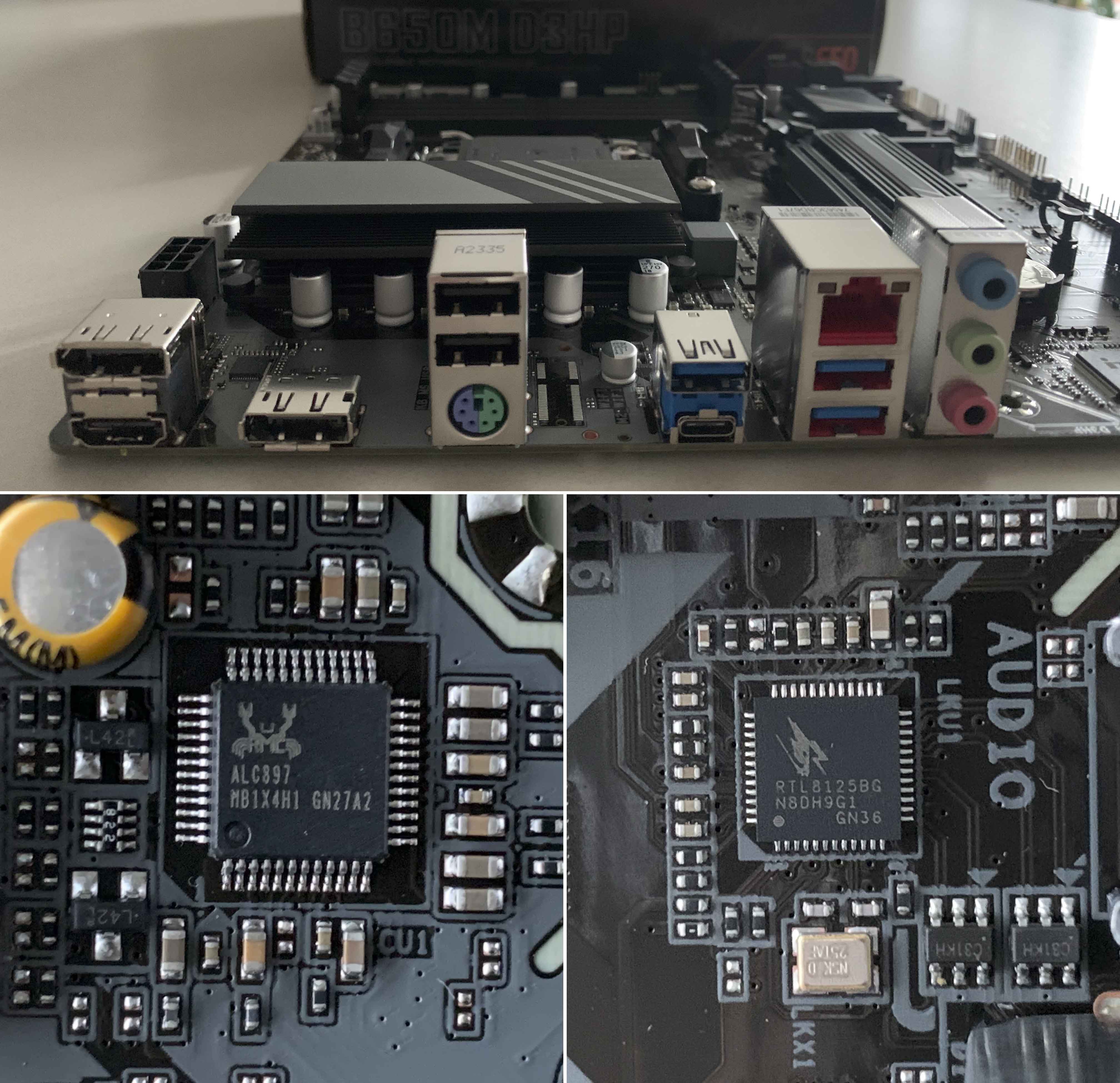 왼쪽에서 부터 HDIM / DP 포트, DP 포트, PS/2, USB2.0 2개(검정색), USB3.2 Gen1 Type-C, USB3.2 Type-A Gen2(파란색), USB3.2 Gen1 Type-A(파란색), 리얼텍 랜(Realtek RTL8125BG), 오디오 포트(Realtek ALC 897 최대 24비트/192kHz 재생을 지원) 등이 있습니다.