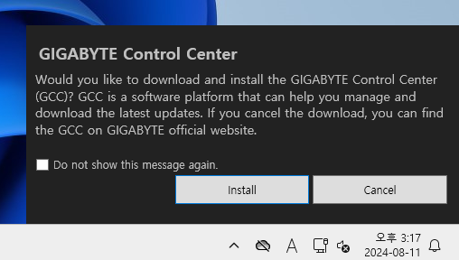 윈도우로 진입하게 되면, 화면 오른쪽 아래에 GCC(GIGABYTE Control Center) 설치 팝업이 나오는데, 안내에 따라 설치를 완료하면 바이오스 설치 및 필요한 드라이버를 편리하게 설치가 가능합니다.