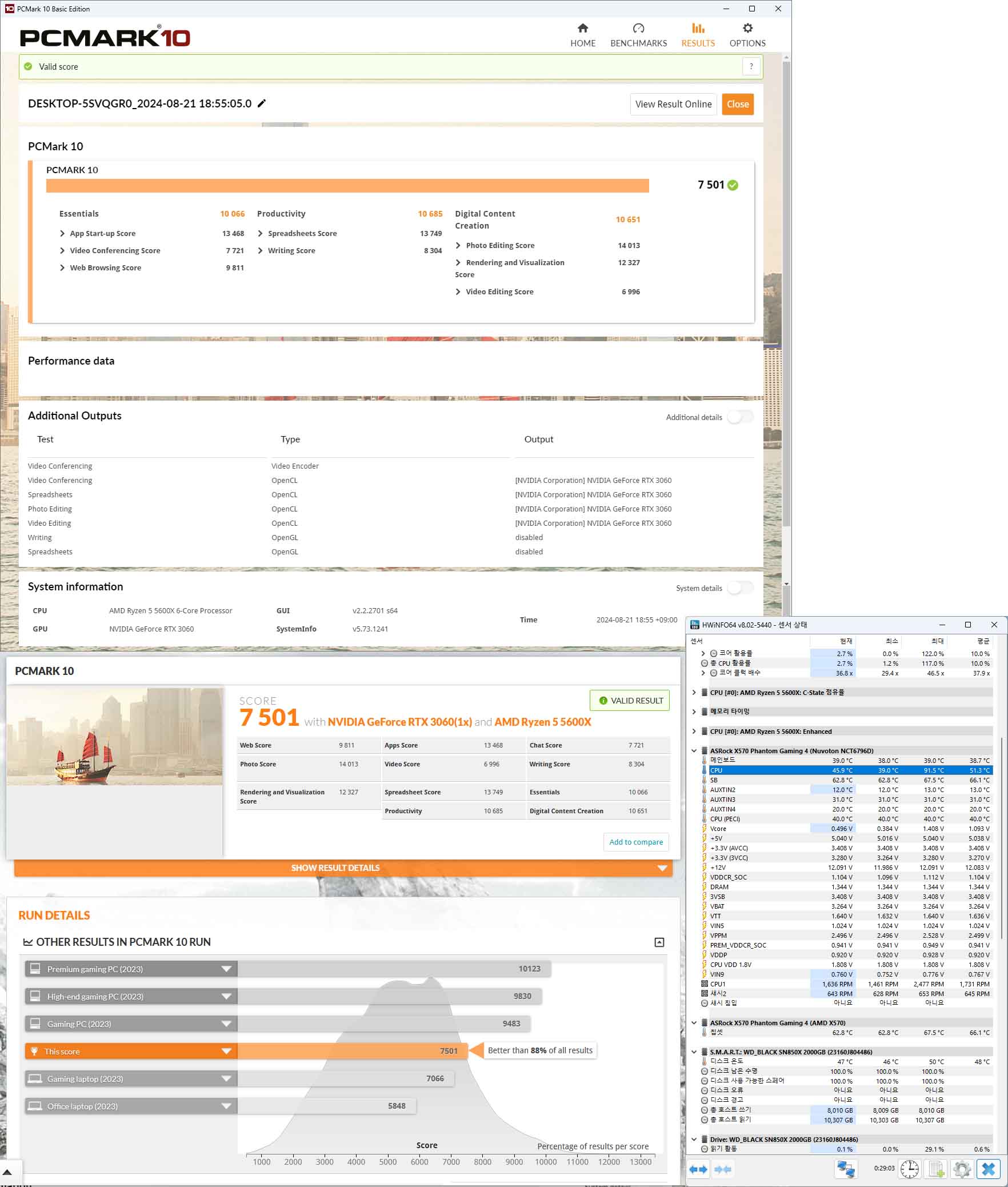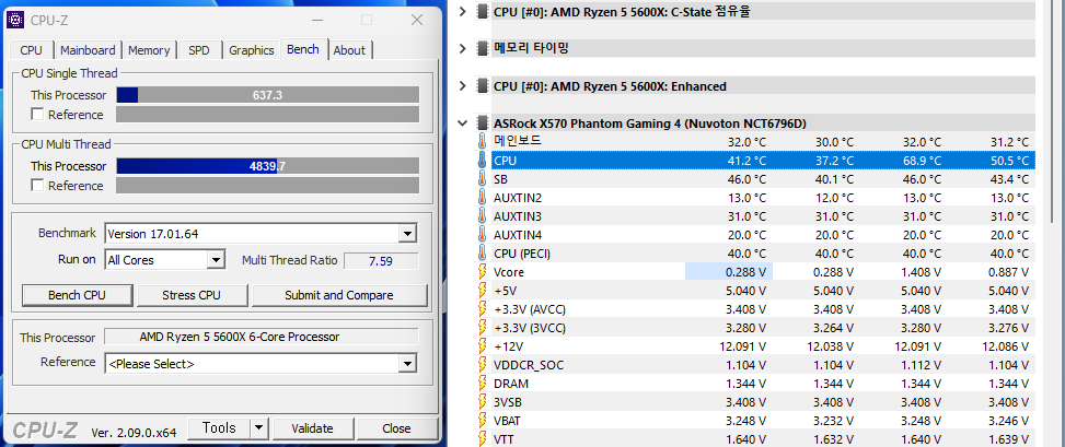 벤치테스트 결과 싱글 637.3점, 멀티 4839.7점의 점수와 최대 온도 68.9도의 결과가 측정되었습니다.