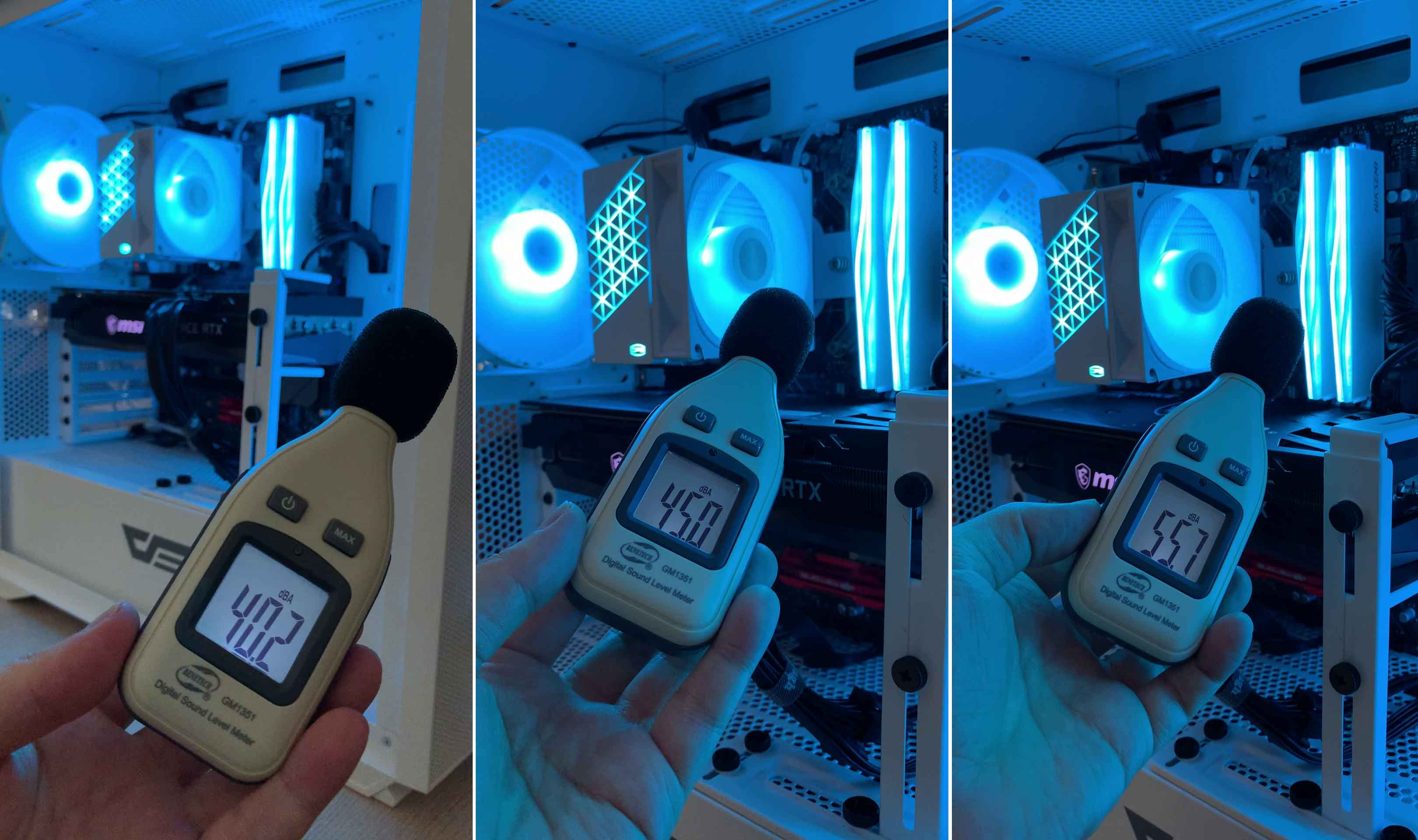 테스트 시스템 주변 소음은 약 40dBA 환경에서, 평소(IDLE상태)에는 약 45dBA, 과부하(FULL LOAD상태)에서는 약 55.7dBA로 측정되었습니다. (측정 방식이나 환경에 따라 다르니 참고만 해주시길 바랍니다.)