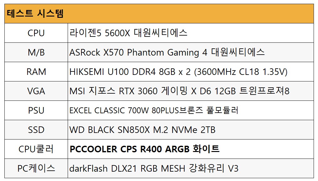 지금까지 PCCOOLER CPS R400 ARGB 화이트에 대해서 살펴보고, 조립 및 테스트를 해보았습니다.