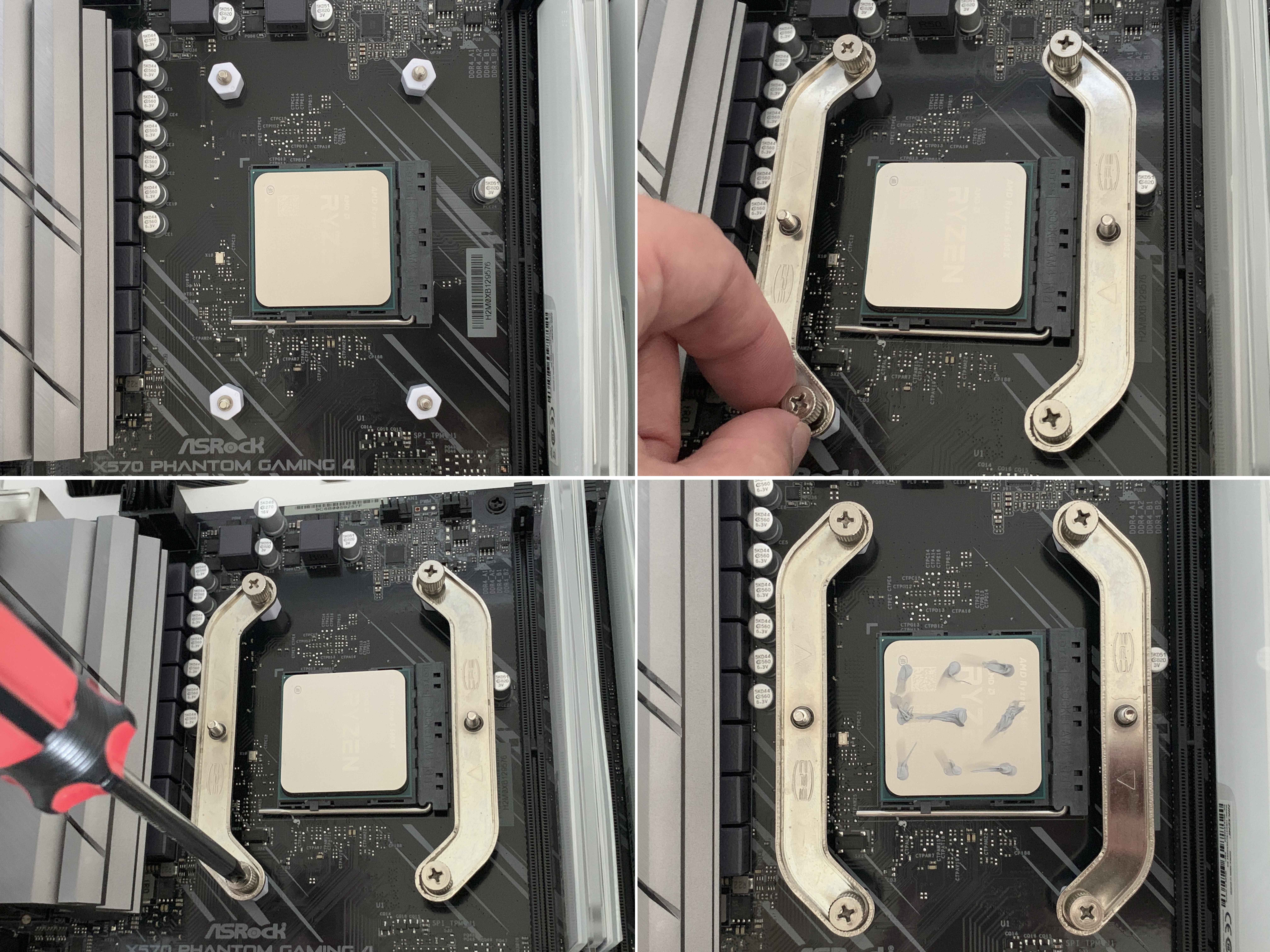 패키지에 포함된 플라스틱 기둥(홈이 있는 쪽이 메인보드쪽으로 향하게 조임)과 AMD 브라켓을 유니버셜 볼츠로 조여 고정시킵니다. 써멀구리스는 골고루 펴질 수 있도록 9개의 점으로 도포했습니다.