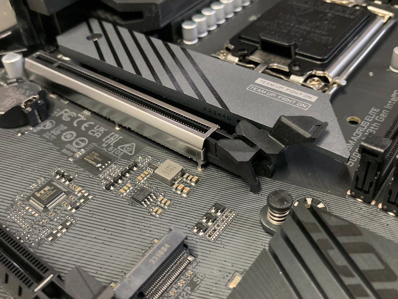 M.2 NVMe SSD 슬롯이 총 2개로 구성되어 있고, 운영체제를 설치할 메인(윗)슬롯은 바닥에 세워질 만큼 듬직한 히트싱크는 온도 걱정이 필요 없을 정도로 안심이 됩니다. 두번째 M.2슬롯은 고정나사가 완전히 사라지도록 개선되어 손으로 M.2 SSD를 손쉽게 장착 및 탈착이 가능하도록 설계되어, 나중에 M.2 SSD 업그레이드시 편하게 교체가 가능하겠습니다.