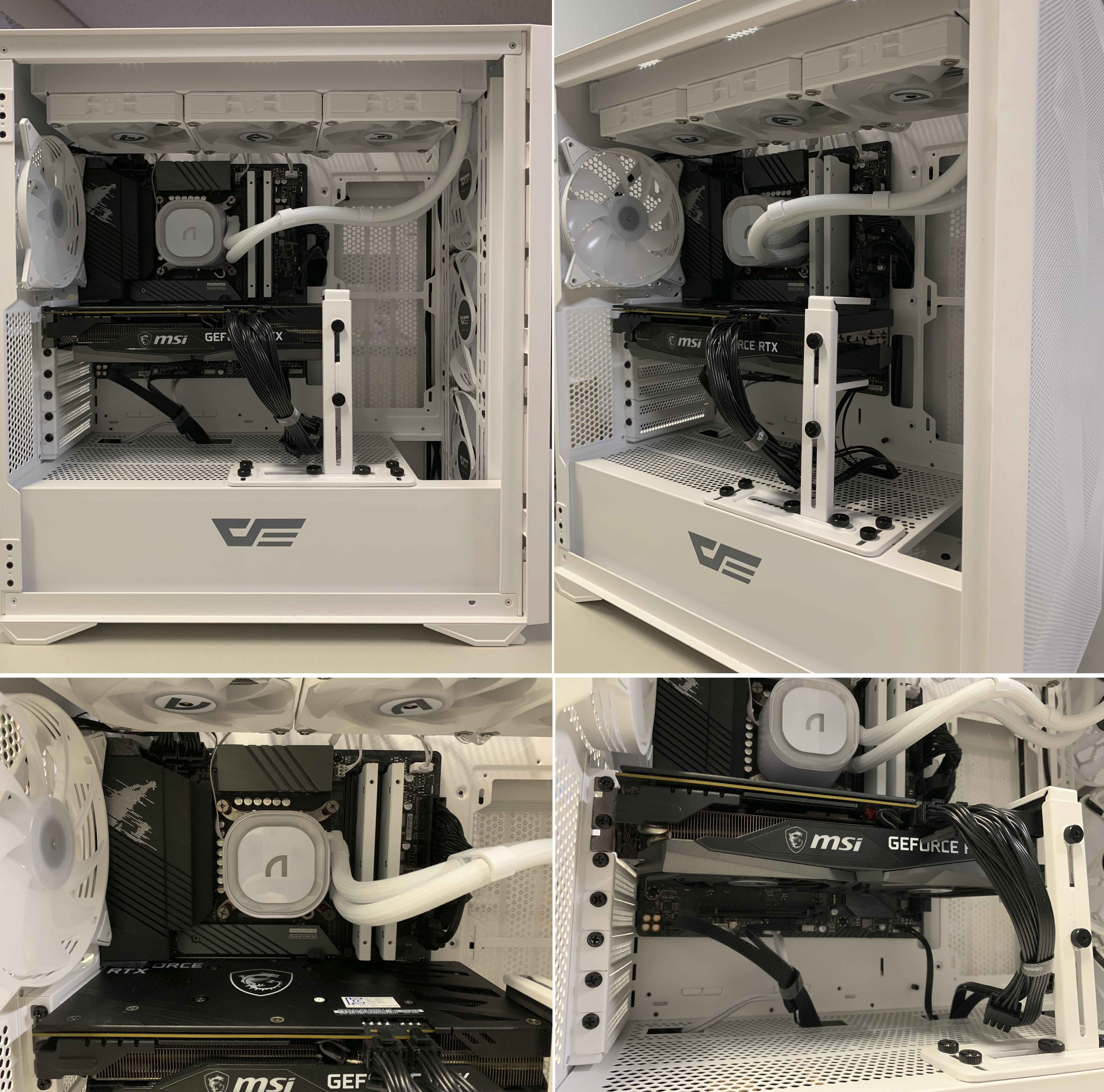 메인보드에 쿨링 팬에 연결할 4핀, 5V 3핀 포트가 넉넉하기 때문에, 요즘 유행하는 어항케이스 환경에서 별도의 팬허브가 없더라도 무난하게 설치가 가능합니다. 테스트에 사용하는 그래픽카드는 PCI 슬롯 2.5개의 두께이며, 최대 슬롯 3.5개 두께의 그래픽카드까지도 무난하게 설치가 가능하겠습니다.