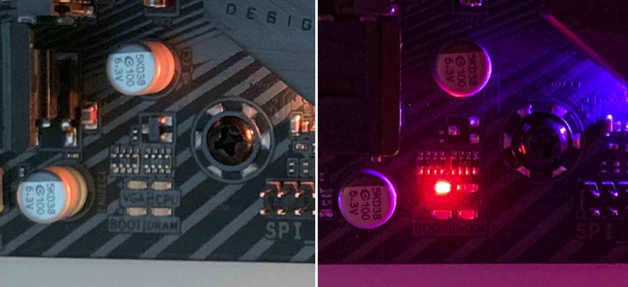 메인보드 하단에는 DEBUG LED가 있습니다. 부팅시 CPU, RAM, 그래픽카드, 저장장치와 같은 주요 구성 요소가 정상적으로 작동하는지 확인할 수 있으며, 부팅이 실패시 빠르게 문제를 파악할 수 있습니다.