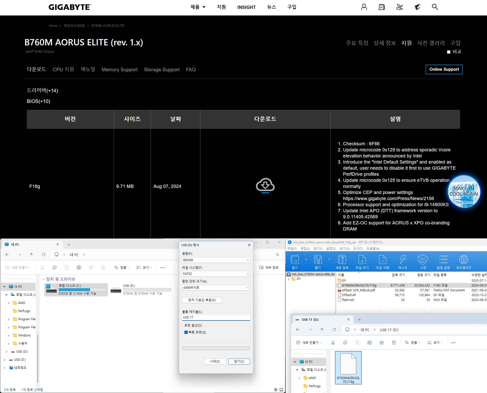 메인보드 홈페이지에 8월 7일 날짜로 업로드된 최신 버전 F18g, 마이크로코드 0x129 파일을 다운 받아, FAT32로 포멧된 USB에 옮깁니다. 부팅시 DEL키를 누르고 바이오스 진입후 바이오스 업데이트 후, Default(기본)상태에서 테스트를 진행합니다.