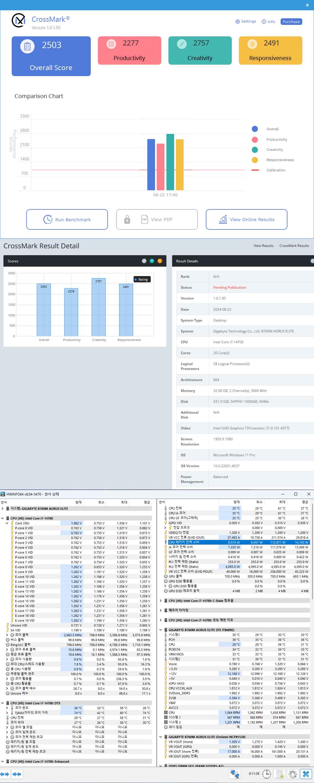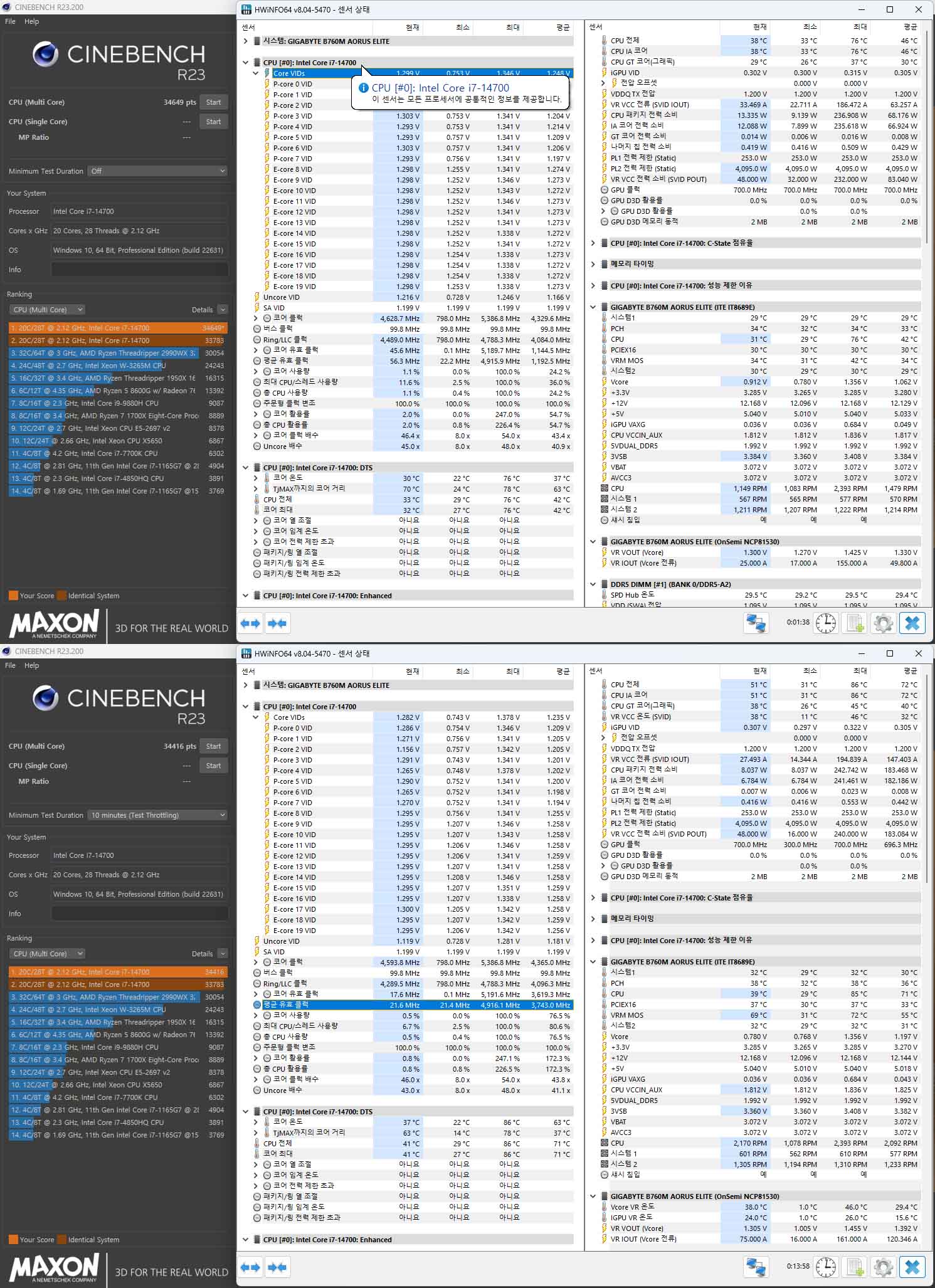 - 개선된 마이크로코드 0x129가 패치된 바이오스 버전을 설치한 메인보드 GIGABYTE B760M AORUS ELITE 환경에서, 인텔 코어 i7-14700은 CINEBENCH R23 프로그램으로 30분이상의 과부하를 주었음에도 최대 1.376V, OCCT 프로그램에서 EXTREME 모드로 10분간 과부하 상태에서 최대 1.362V, 일반적인 작업에 해당하는 PCMARK10이나 CROSSMARK 프로그램에서는 최대 1.360V로 안정적인 전압이 인가됨을 확인했습니다.