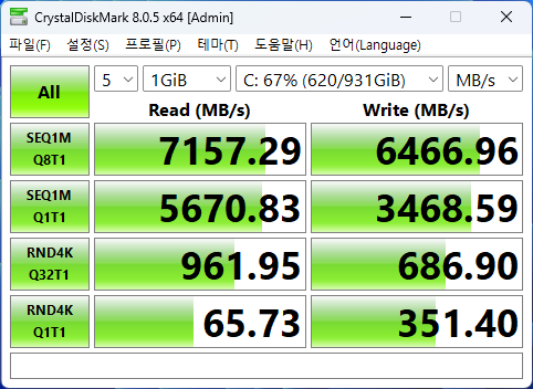 67%의 저장공간인데도 두꺼운 SSD방열판 덕분인지 제품 스펙이상의 결과가 나왔습니다.