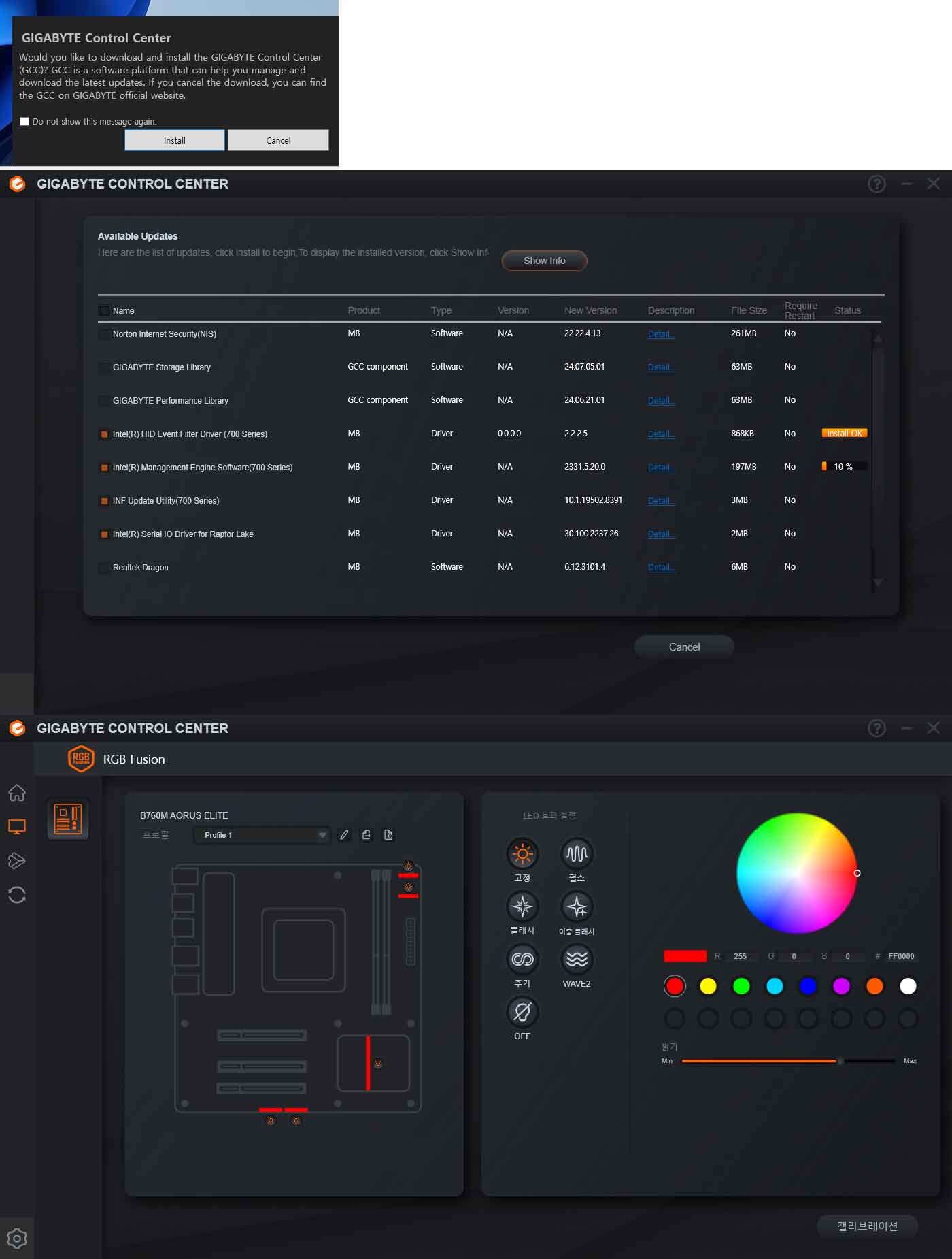 윈도우를 설치 후 부팅하면 GIGABYTE Control Center 알림이 우하단 팝업으로 뜨는데 그대로 설치를 진행하면 시스템에 필요한 드라이버와 소프트웨어를 손쉽게 설치할 수 있게 도와줍니다.