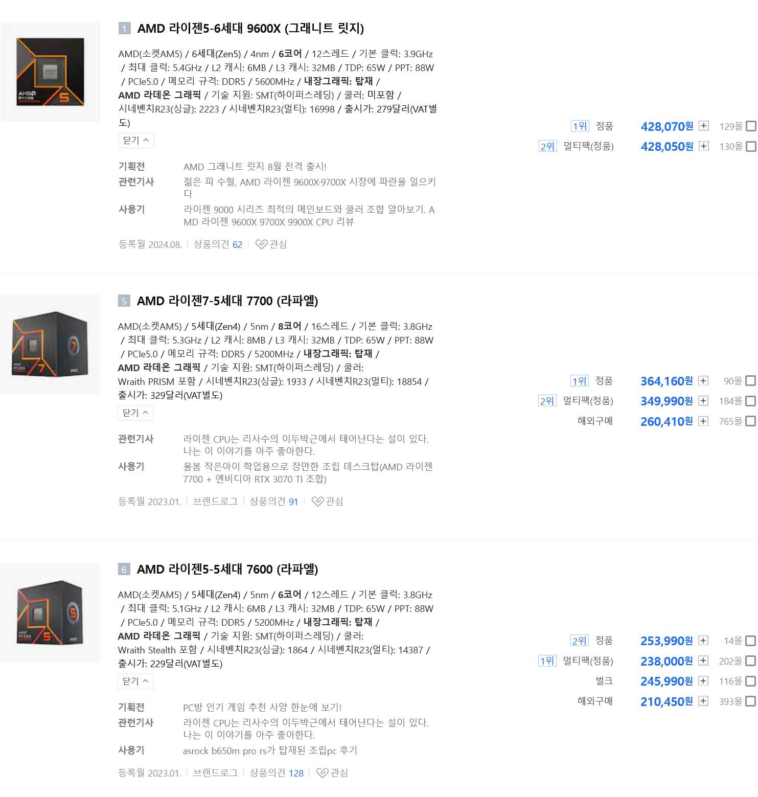 현재 라이젠7 7700은 약 36만원이지만, 라이젠5 9600X는 약 43만원에 판매되고 있습니다.
