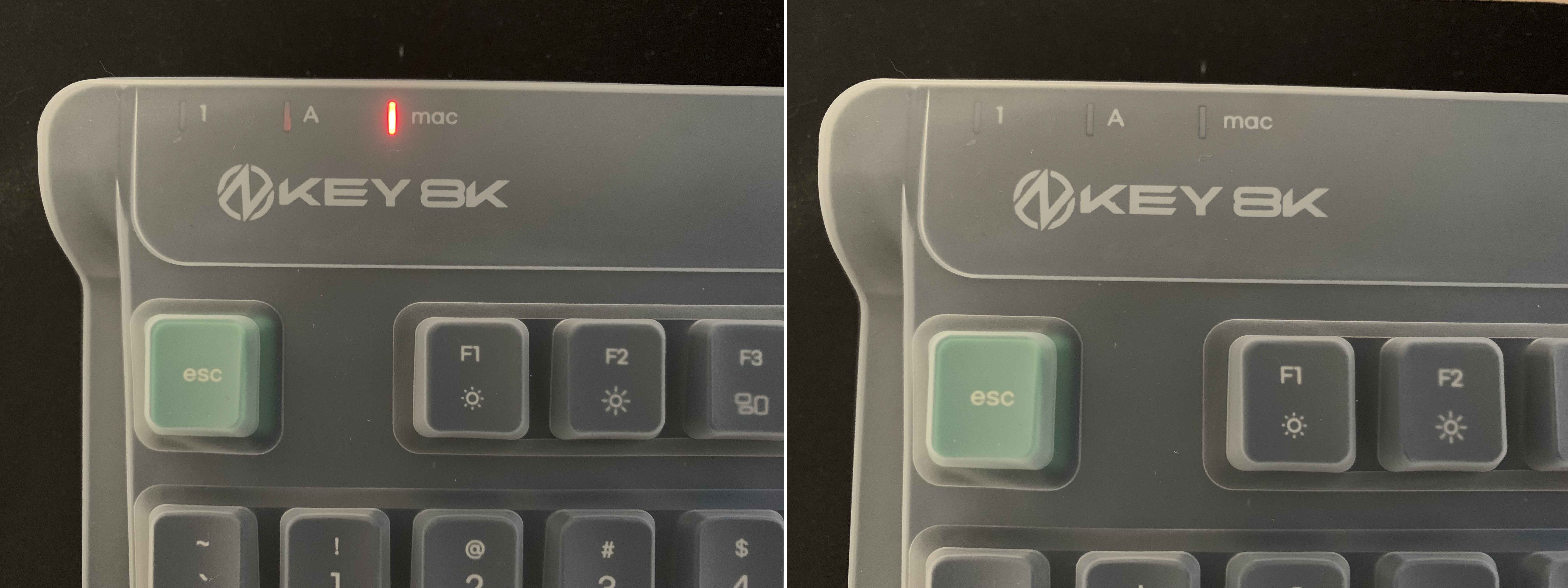 처음 연결했을때, Mac OS모드로 설정되어 있어서 왼쪽 사진 처럼 빨간 불이 들어왔습니다. FN + W 를 눌러서 윈도우 OS모드로 변경하면 오른쪽 사진 처럼 빨간 불이 꺼집니다.