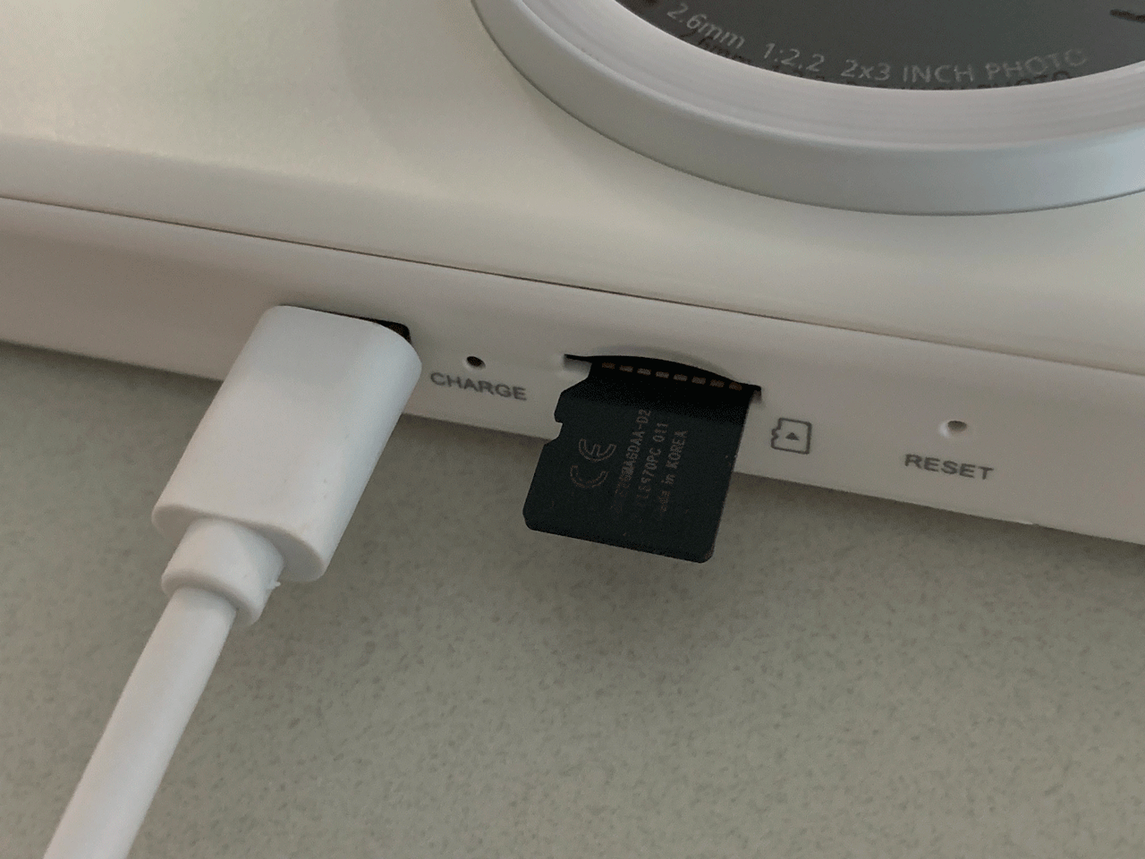 구성품은 카메라, 간단한 사용자 가이드, 충전케이스, 손목스트랩, 인화지 10매, 충전케이블로 구성되어 있습니다.