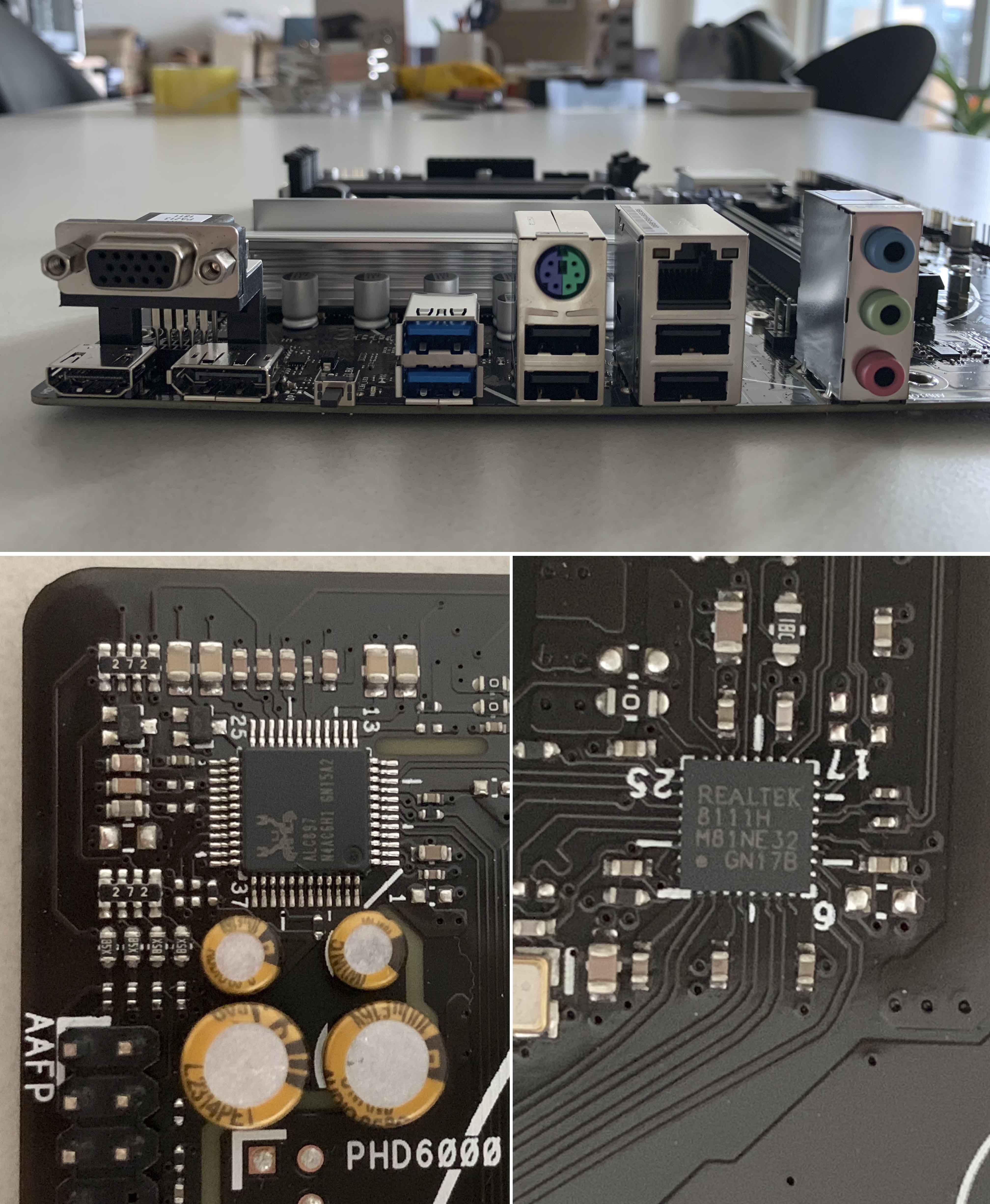 왼쪽에서 부터 HDIM / VGA / DP 포트, BIOS 플래시백 버튼, USB3.2 Gen1 Type-A 2개(파란색), PS/2, USB2.0 Type-A 4개(검정색), 1Gbps 랜(Realtek RTL8111H), 오디오 포트(Realtek ALC 897 최대 24비트/192kHz 재생을 지원) 등이 있습니다.