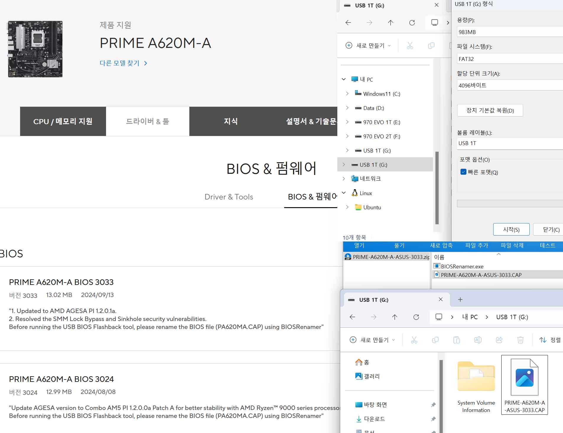 USB를 FAT32로 포멧 후, 공식사이트에서 다운 받은 파일을 옮긴후, 직접 바이오스에서 버전업을 실행했습니다.