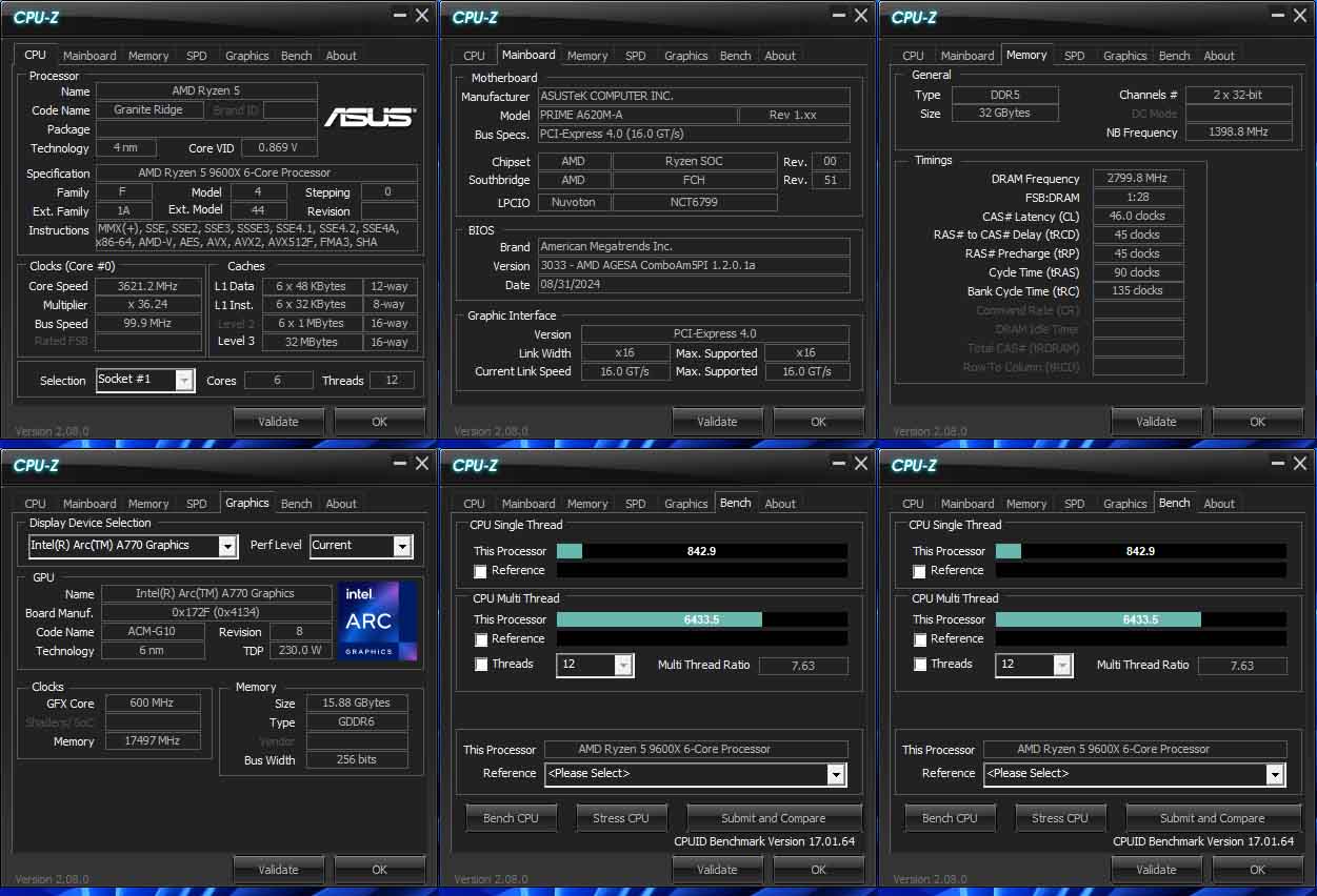 CPU-Z에서 바이오스에서 설정한 값이 동일함을 알 수 있으며, 벤치테스트 2회 실행 결과 싱글 842.9/841.2점, 멀티 6433.5/6436.7점이 측정되었습니다.