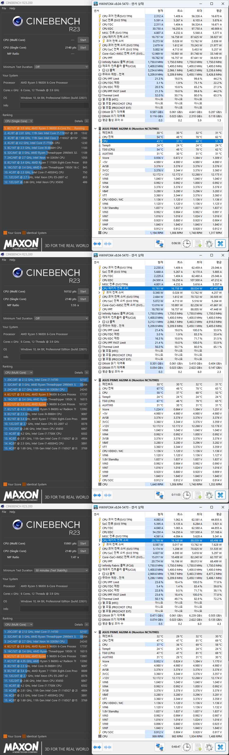 CINEBECH R23 프로그램에서 싱글 1회/멀티 1회/멀티 30분 실행한 결과입니다.